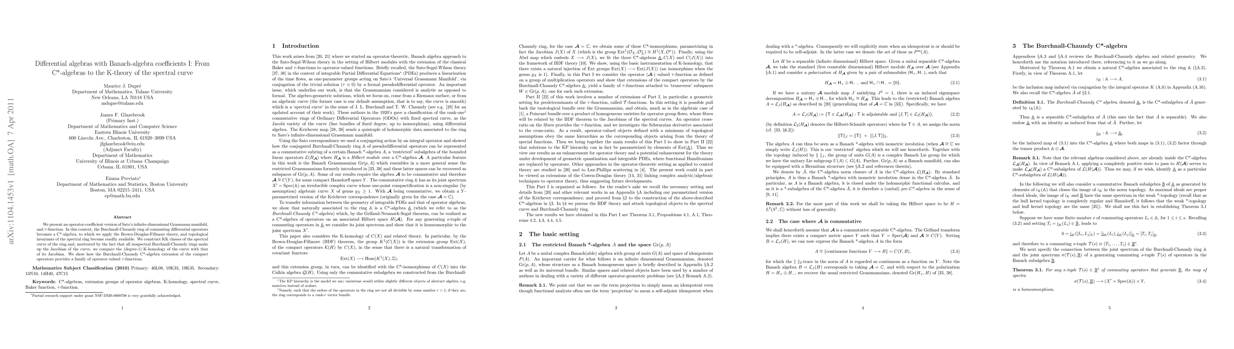 We present an operator-coefficient version of Sato's infinite-dimensional Grassmann manifold, and tau-function. In this context, the Burchnall-Chaundy ring of commuting differential operators becomes a C*-algebra, to which we apply the Brown-Douglas-Fillmore theory, and topological invariants of the spectral ring become readily available. We construct KK classes of the spectral curve of the ring and, motivated by the fact that all isospectral Burchnall-Chaundy rings make up the Jacobian of the curve, we compare the (degree-1) K-homology of the curve with that of its Jacobian. We show how the Burchnall-Chaundy C*-algebra extension of the compact operators provides a family of operator-valued tau-functions.