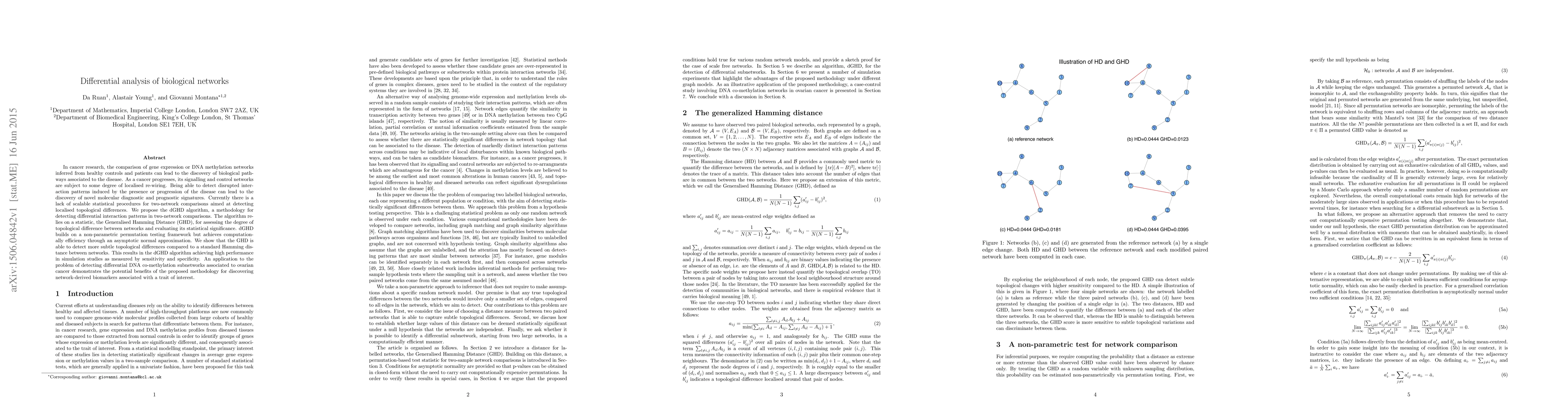 In cancer research, the comparison of gene expression or DNA methylation networks inferred from healthy controls and patients can lead to the discovery of biological pathways associated to the disease. As a cancer progresses, its signalling and control networks are subject to some degree of localised re-wiring. Being able to detect disrupted interaction patterns induced by the presence or progression of the disease can lead to the discovery of novel molecular diagnostic and prognostic signatures. Currently there is a lack of scalable statistical procedures for two-network comparisons aimed at detecting localised topological differences. We propose the dGHD algorithm, a methodology for detecting differential interaction patterns in two-network comparisons. The algorithm relies on a statistic, the Generalised Hamming Distance (GHD), for assessing the degree of topological difference between networks and evaluating its statistical significance. dGHD builds on a non-parametric permutation testing framework but achieves computationally efficiency through an asymptotic normal approximation. We show that the GHD is able to detect more subtle topological differences compared to a standard Hamming distance between networks. This results in the dGHD algorithm achieving high performance in simulation studies as measured by sensitivity and specificity. An application to the problem of detecting differential DNA co-methylation subnetworks associated to ovarian cancer demonstrates the potential benefits of the proposed methodology for discovering network-derived biomarkers associated with a trait of interest.