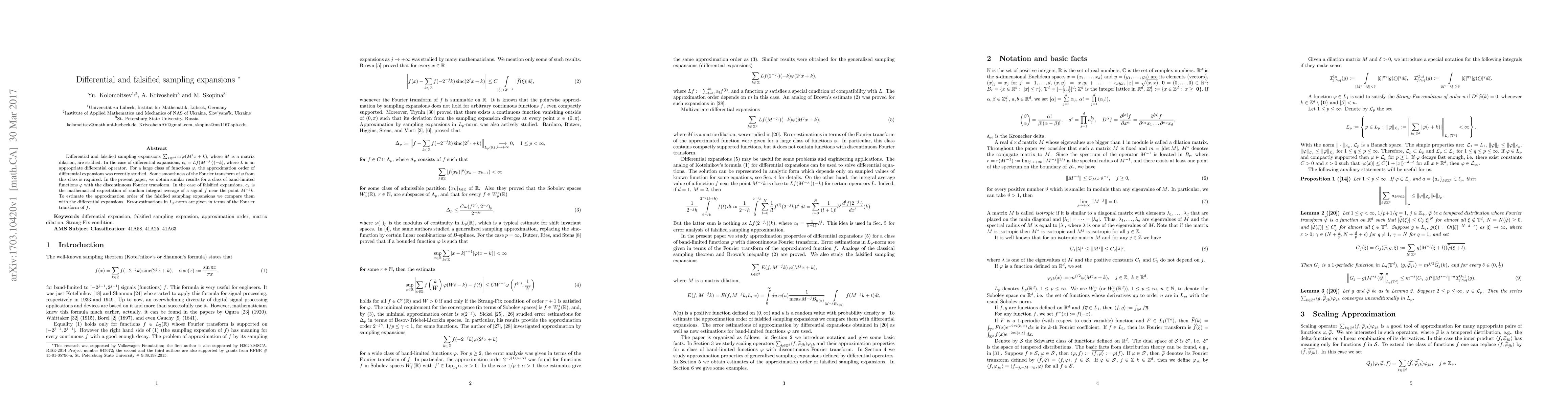 Differential and falsified sampling expansions $\sum_{k\in \mathbb{Z}^d}c_k\phi(M^jx+k)$, where $M$ is a matrix dilation, are studied. In the case of differential expansions, $c_k=Lf(M^{-j}\cdot)(-k)$, where $L$ is an appropriate differential operator. For a large class of functions $\phi$, the approximation order of differential expansions was recently studied. Some smoothness of the Fourier transform of $\phi$ from this class is required. In the present paper, we obtain similar results for a class of band-limited functions $\phi$ with the discontinuous Fourier transform. In the case of falsified expansions, $c_k$ is the mathematical expectation of random integral average of a signal $f$ near the point $M^{-j}k$. To estimate the approximation order of the falsified sampling expansions we compare them with the differential expansions. Error estimations in $L_p$-norm are given in terms of the Fourier transform of $f$.