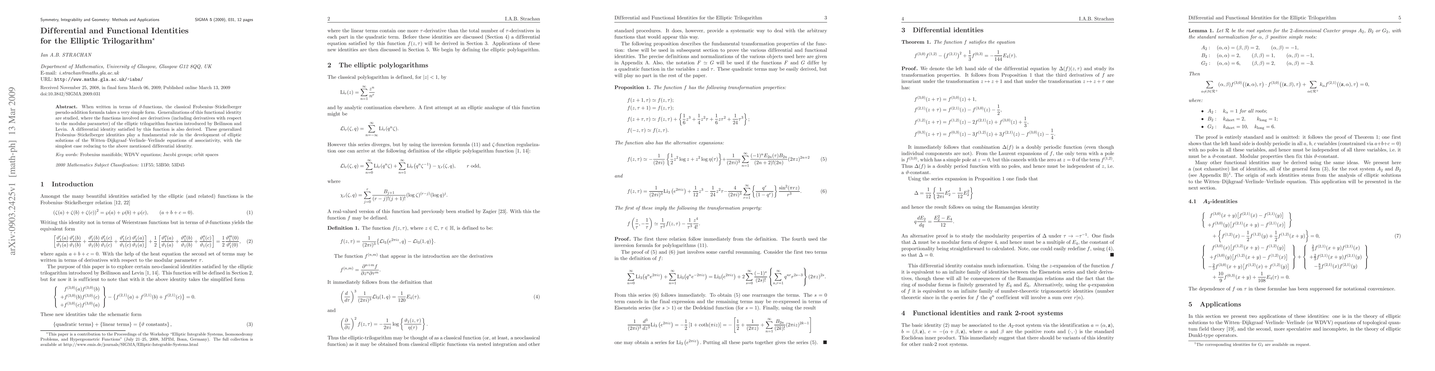 When written in terms of $\vartheta$-functions, the classical Frobenius-Stickelberger pseudo-addition formula takes a very simple form. Generalizations of this functional identity are studied, where the functions involved are derivatives (including derivatives with respect to the modular parameter) of the elliptic trilogarithm function introduced by Beilinson and Levin. A differential identity satisfied by this function is also derived. These generalized Frobenius-Stickelberger identities play a fundamental role in the development of elliptic solutions of the Witten-Dijkgraaf-Verlinde-Verlinde equations of associativity, with the simplest case reducing to the above mentioned differential identity.