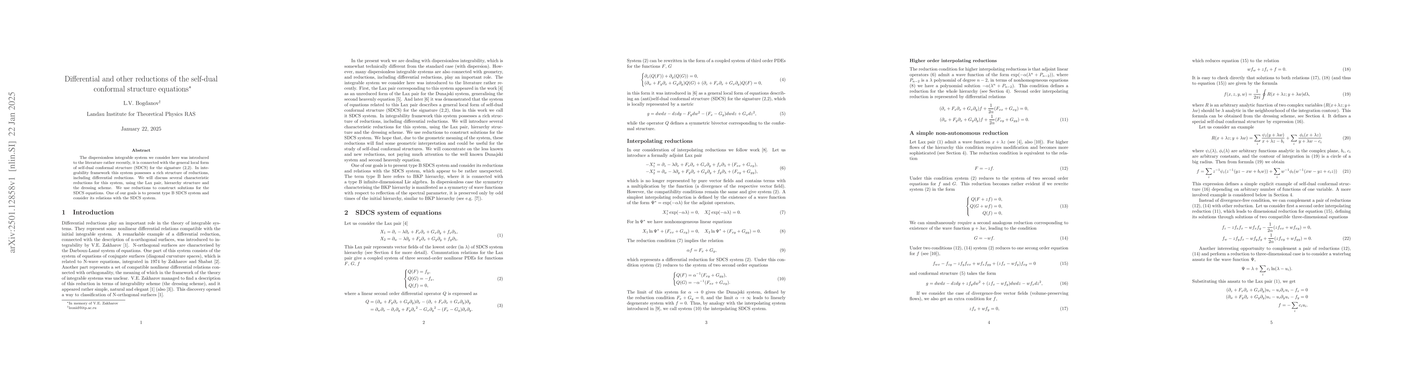 This paper explores differential and other reductions of a recently introduced dispersionless integrable system related to self-dual conformal structure equations, utilizing Lax pairs, hierarchies, and dressing schemes to construct solutions, with a particular focus on type B SDCS systems and their relationships.