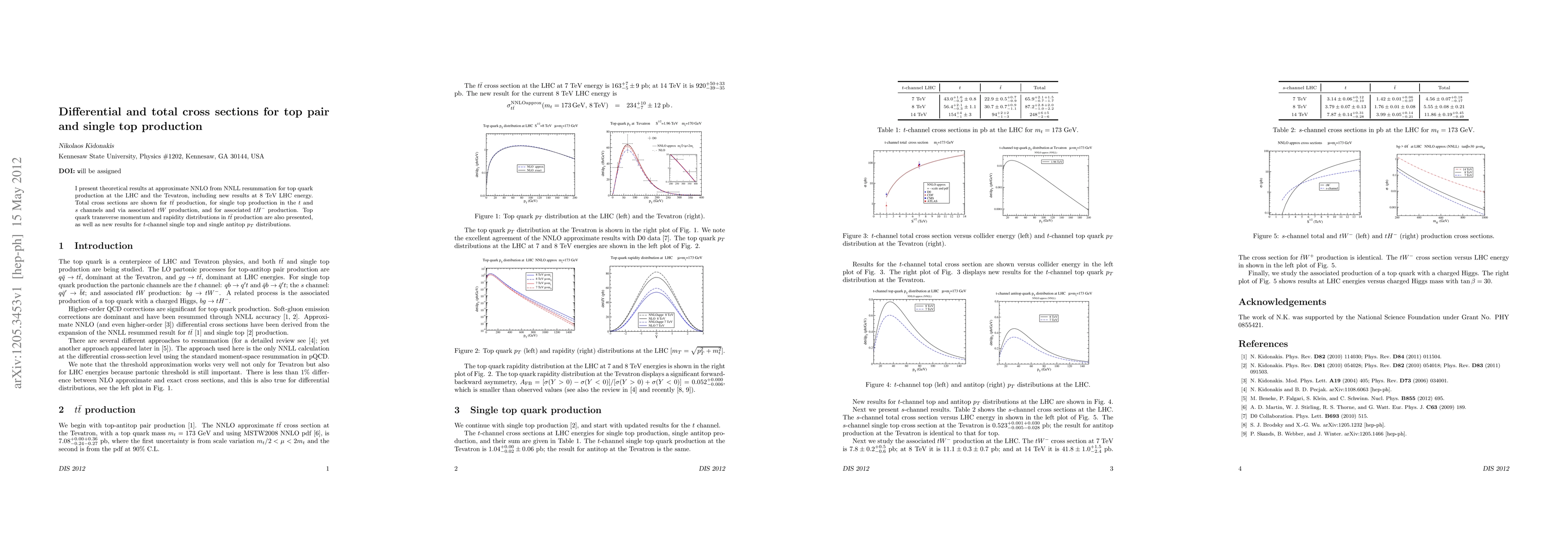 This paper presents theoretical results at approximate NNLO from NNLL resummation for top quark production at the LHC and Tevatron, including new results at 8 TeV. It details total cross sections for top pair, single top, and associated tH production, along with distributions for top quark transverse momentum and rapidity.