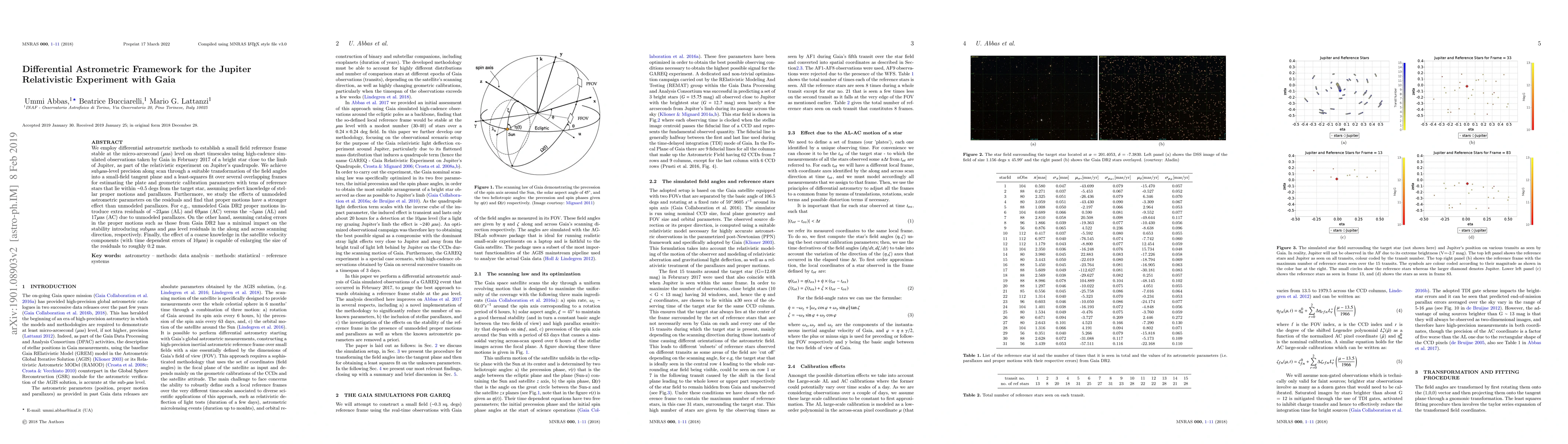 This paper develops a differential astrometric framework to create a micro-arcsecond stable reference frame for a relativistic experiment on Jupiter using Gaia data. It finds that unmodeled proper motions introduce larger residuals than parallaxes, while satellite velocity uncertainties can significantly impact the results.