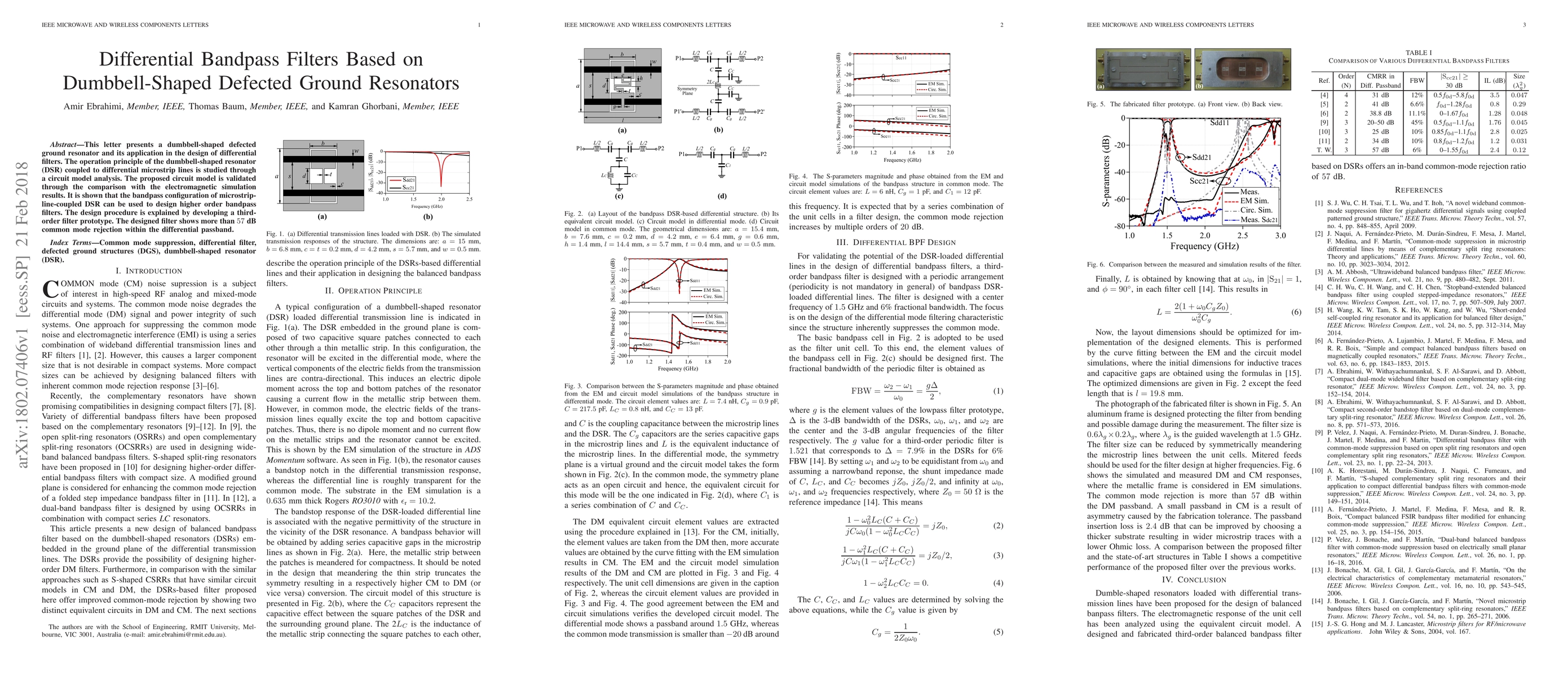 This paper introduces a dumbbell-shaped defected ground resonator for differential bandpass filters, demonstrating its application through a validated circuit model and electromagnetic simulations. The proposed design achieves higher-order filters with over 57 dB common mode rejection in the differential passband.