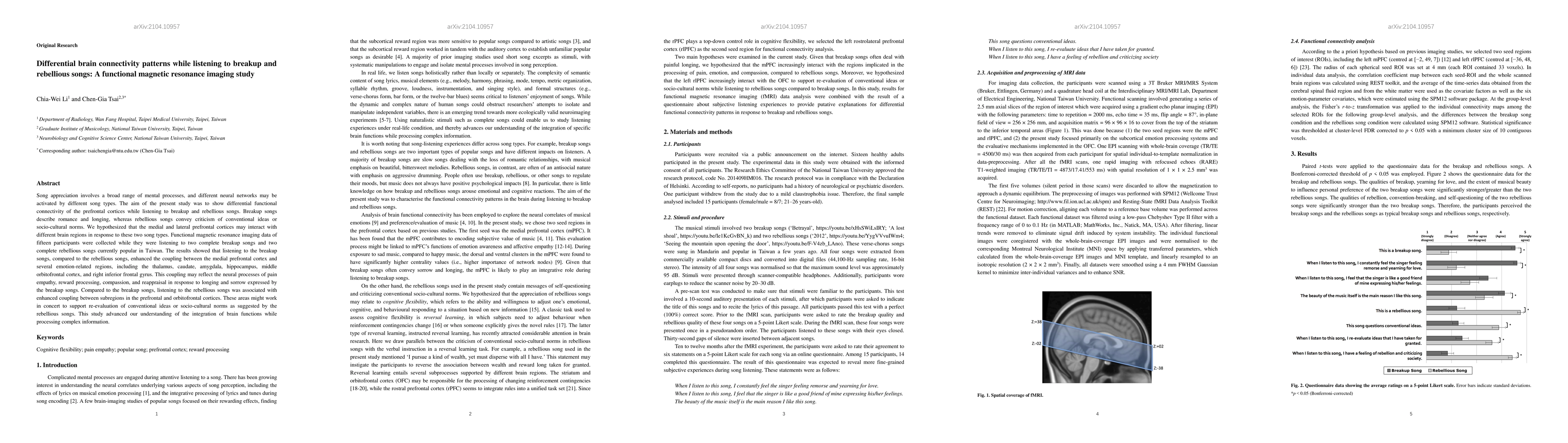 This study used fMRI to investigate how different types of songs—breakup and rebellious—activate distinct brain connectivity patterns. The results showed that breakup songs enhanced connections between the medial prefrontal cortex and emotion-related regions, suggesting processes like empathy and reward processing. In contrast, rebellious songs increased connectivity in prefrontal and orbitofrontal regions, indicating re-evaluation of norms.