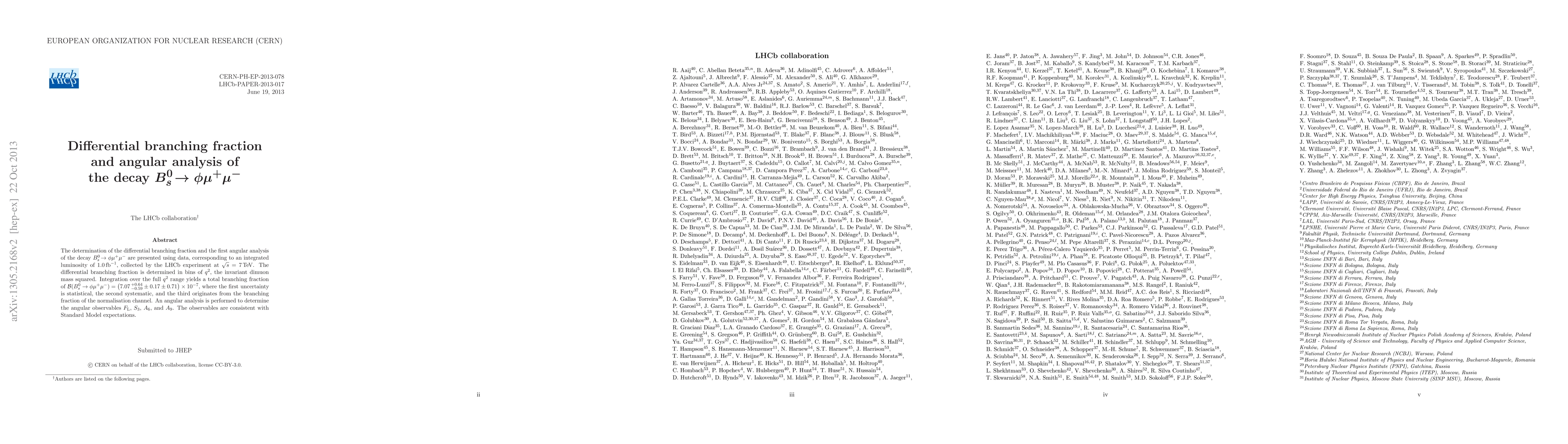 This paper presents the differential branching fraction and the first angular analysis of the decay $B_s^0\to\phi\mu^{+}\mu^{-}$ using LHCb data at $7\,{\rm TeV}$, yielding a total branching fraction of $(7.07\pm 0.64\pm 0.17\pm 0.71)\times 10^{-7}$. The angular observables are consistent with Standard Model predictions.