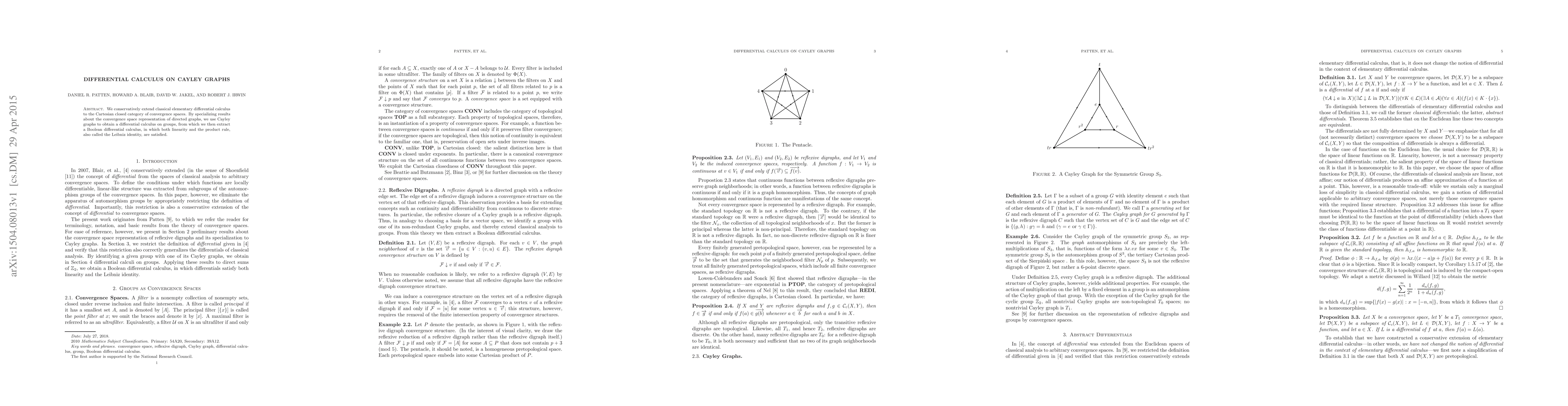 We conservatively extend classical elementary differential calculus to the Cartesian closed category of convergence spaces. By specializing results about the convergence space representation of directed graphs, we use Cayley graphs to obtain a differential calculus on groups, from which we then extract a Boolean differential calculus, in which both linearity and the product rule, also called the Leibniz identity, are satisfied.