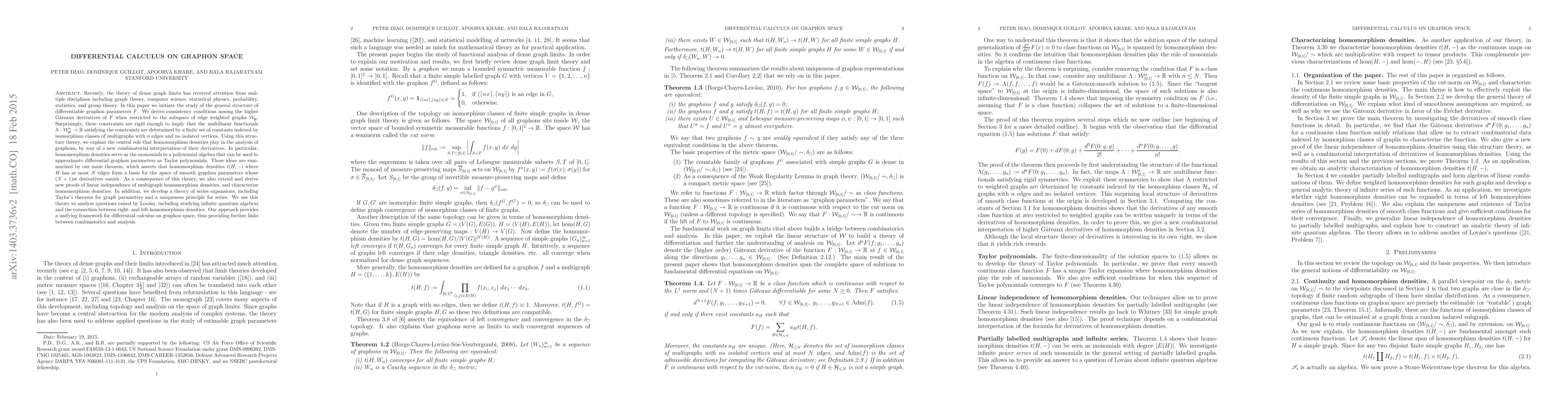 Recently, the theory of dense graph limits has received attention from multiple disciplines including graph theory, computer science, statistical physics, probability, statistics, and group theory. In this paper we initiate the study of the general structure of differentiable graphon parameters $F$. We derive consistency conditions among the higher G\^ateaux derivatives of $F$ when restricted to the subspace of edge weighted graphs $\mathcal{W}_{\bf p}$. Surprisingly, these constraints are rigid enough to imply that the multilinear functionals $\Lambda: \mathcal{W}_{\bf p}^n \to \mathbb{R}$ satisfying the constraints are determined by a finite set of constants indexed by isomorphism classes of multigraphs with $n$ edges and no isolated vertices. Using this structure theory, we explain the central role that homomorphism densities play in the analysis of graphons, by way of a new combinatorial interpretation of their derivatives. In particular, homomorphism densities serve as the monomials in a polynomial algebra that can be used to approximate differential graphon parameters as Taylor polynomials. These ideas are summarized by our main theorem, which asserts that homomorphism densities $t(H,-)$ where $H$ has at most $N$ edges form a basis for the space of smooth graphon parameters whose $(N+1)$st derivatives vanish. As a consequence of this theory, we also extend and derive new proofs of linear independence of multigraph homomorphism densities, and characterize homomorphism densities. In addition, we develop a theory of series expansions, including Taylor's theorem for graph parameters and a uniqueness principle for series. We use this theory to analyze questions raised by Lov\'asz, including studying infinite quantum algebras and the connection between right- and left-homomorphism densities.