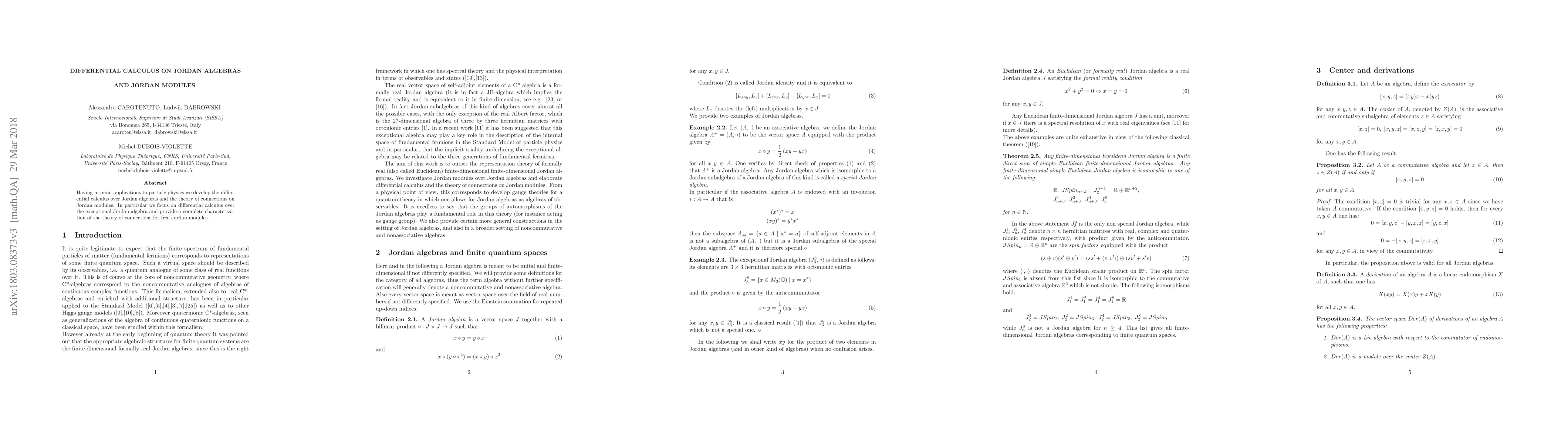 This paper develops the differential calculus over Jordan algebras with a focus on the exceptional Jordan algebra, and provides a complete characterization of connections on free Jordan modules, with applications to particle physics in mind.
