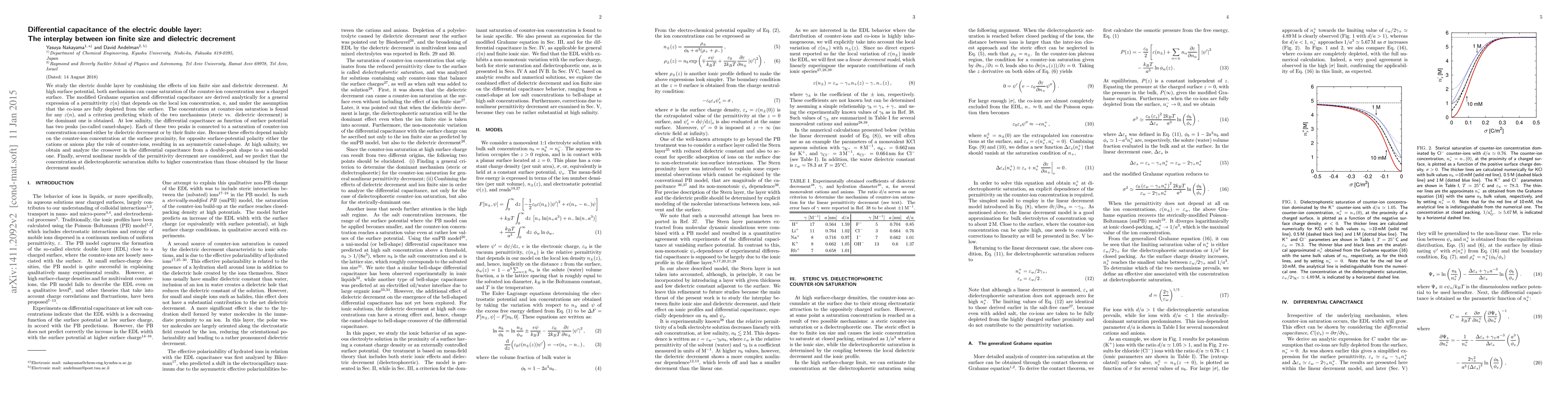 We study the electric double layer by combining the effects of ion finite size and dielectric decrement. At high surface potential, both mechanisms can cause saturation of the counter-ion concentration near a charged surface. The modified Grahame equation and differential capacitance are derived analytically for a general expression of a permittivity epsilon(n) that depends on the local ion concentration, n, and under the assumption that the co-ions are fully depleted from the surface. The concentration at counter-ion saturation is found for any epsilon(n), and a criterion predicting which of the two mechanisms (steric vs. dielectric decrement) is the dominant one is obtained. At low salinity, the differential capacitance as function of surface potential has two peaks (so-called camel-shape). Each of these two peaks is connected to a saturation of counter-ion concentration caused either by dielectric decrement or by their finite size. Because these effects depend mainly on the counter-ion concentration at the surface proximity, for opposite surface-potential polarity either the cations or anions play the role of counter-ions, resulting in an asymmetric camel-shape. At high salinity, we obtain and analyze the crossover in the differential capacitance from a double-peak shape to a uni-modal one. Finally, several nonlinear models of the permittivity decrement are considered, and we predict that the concentration at dielectrophoretic saturation shifts to higher concentration than those obtained by the linear decrement model.