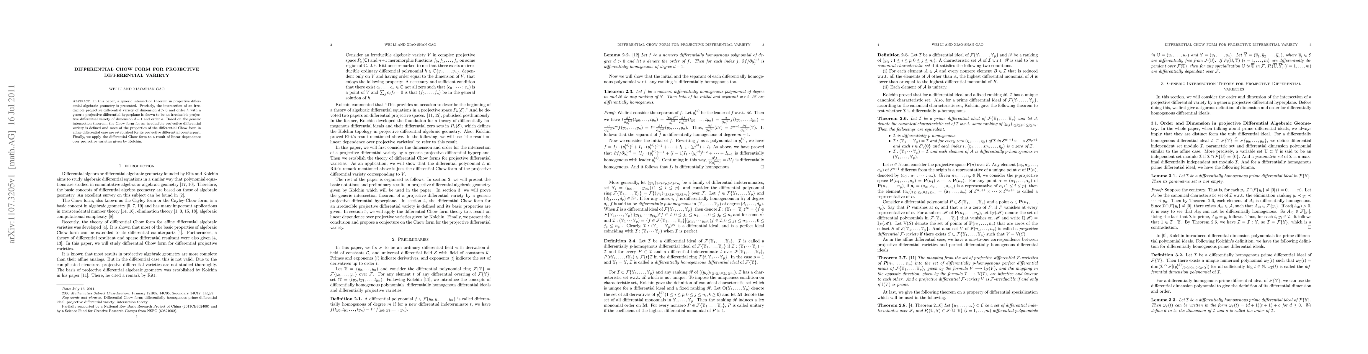This paper establishes a generic intersection theorem in projective differential algebraic geometry, demonstrating that the intersection of an irreducible projective differential variety with a generic projective differential hyperplane results in a variety of reduced dimension and the same order. It defines the differential Chow form for projective differential varieties and verifies its properties, extending those known in the affine differential case, and applies this to Kolchin's result on linear dependence over projective varieties.