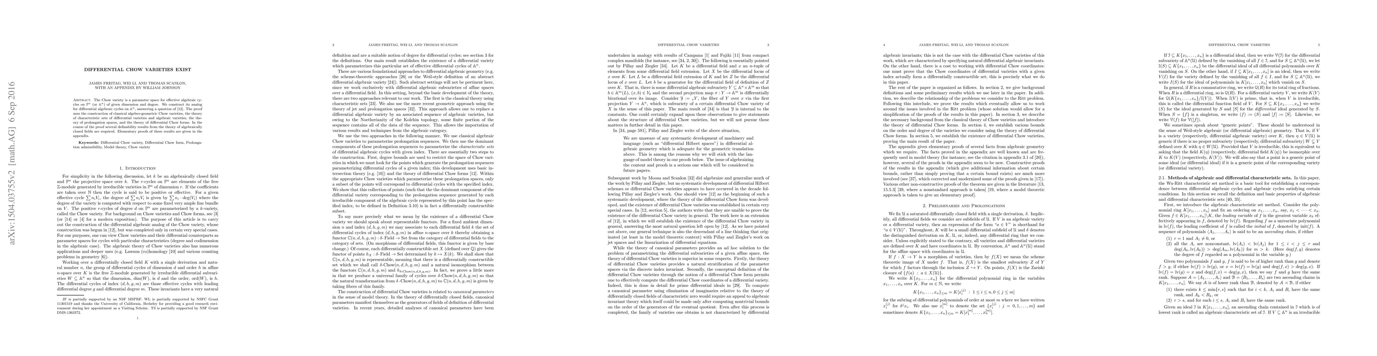 The paper constructs differential Chow varieties for differential algebraic subvarieties, utilizing classical Chow theory, characteristic sets, and prolongation spaces. The proof includes definability results from algebraically closed fields, with elementary proofs provided in an appendix by William Johnson.