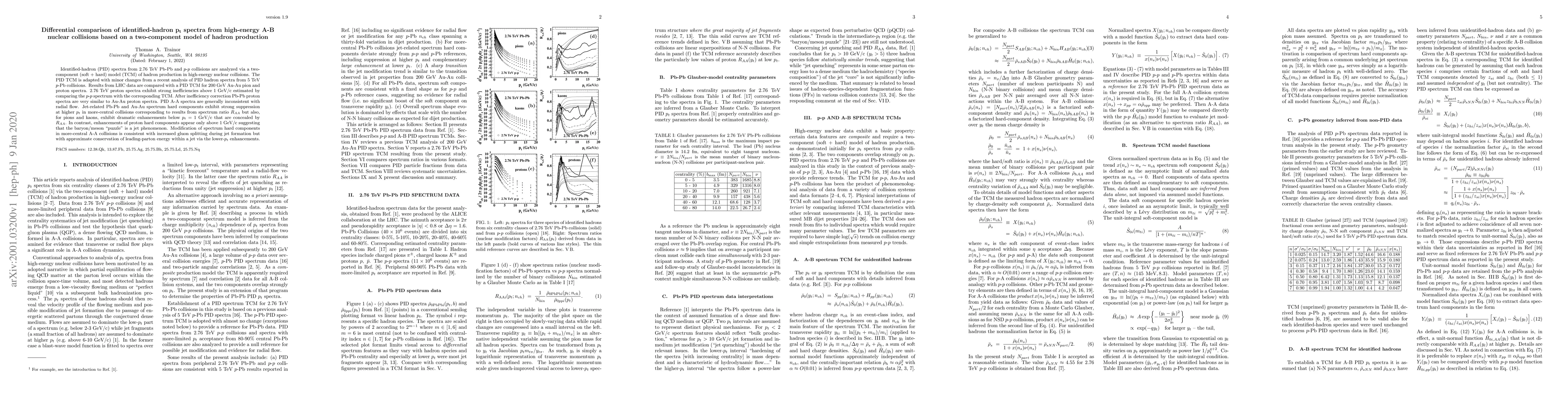This paper analyzes identified-hadron spectra from high-energy nuclear collisions using a two-component model, finding that proton spectra in Pb-Pb collisions resemble those in Au-Au collisions after correcting for inefficiencies. The study reveals significant suppression and enhancements in the hard components of these spectra, suggesting a jet-related baryon/meson "puzzle" and increased gluon splitting during jet formation.