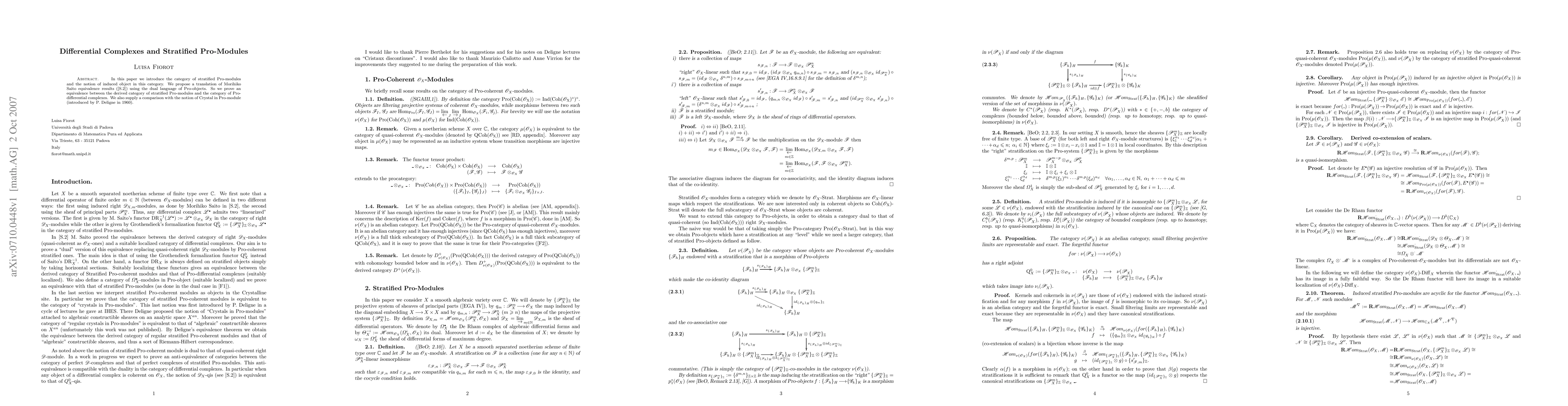 This paper establishes an equivalence between the derived category of stratified Pro-modules and the category of Pro-differential complexes, translating a Morihiko Saito equivalence result through the dual language of Pro-objects, and compares it with P. Deligne’s notion of Crystal in Pro-module.