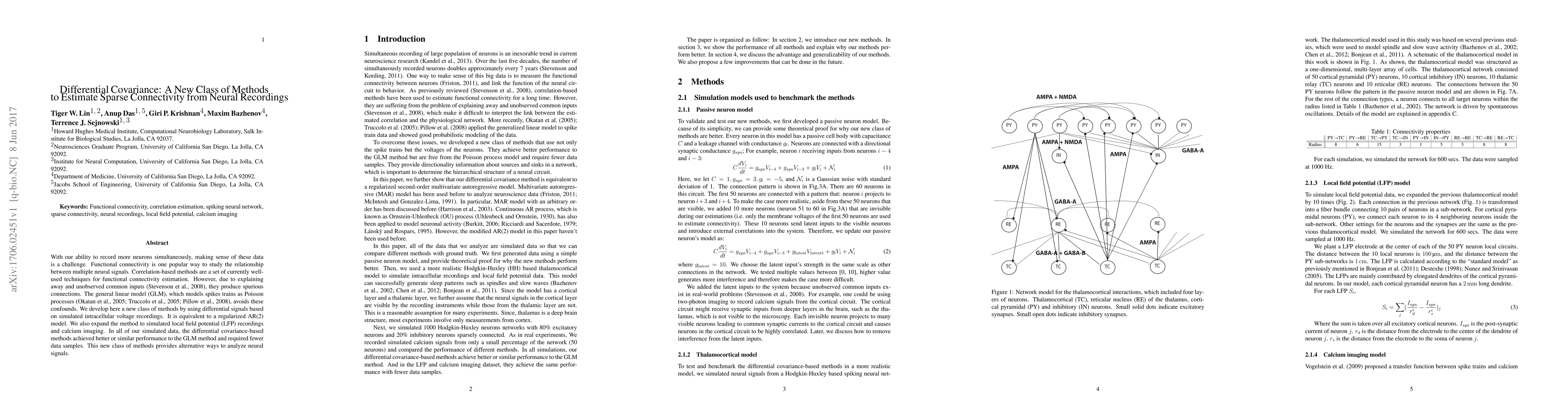 This paper introduces differential covariance methods as a new approach to estimate sparse connectivity from neural recordings, offering a regularized AR(2) model that performs better or similarly to the general linear model (GLM) while requiring fewer data samples. These methods provide an alternative to correlation-based techniques for analyzing neural signals.