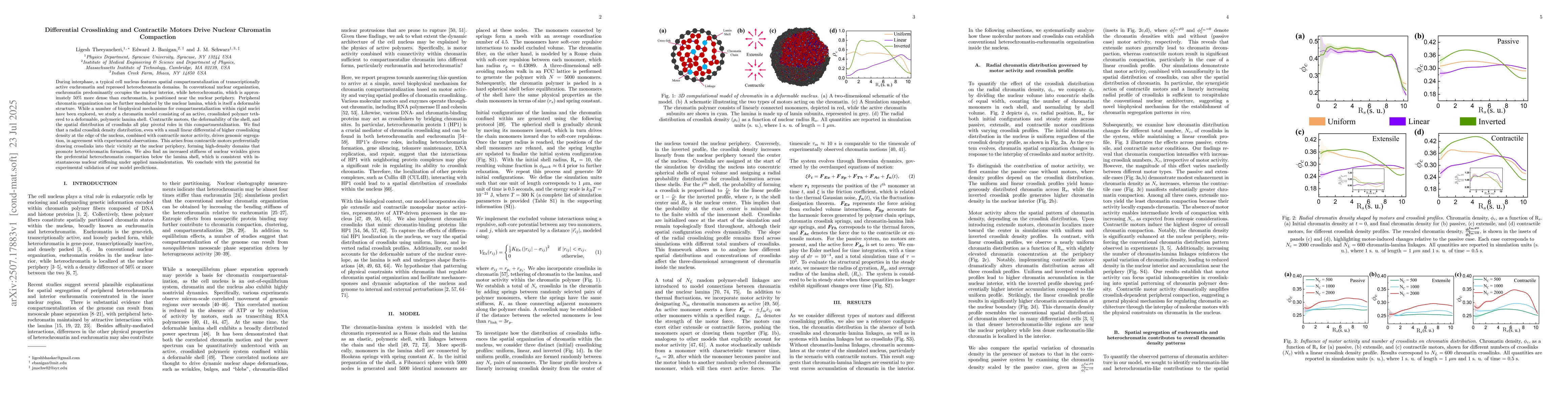 During interphase, a typical cell nucleus features spatial compartmentalization of transcriptionally active euchromatin and repressed heterochromatin domains. In conventional nuclear organization, euchromatin predominantly occupies the nuclear interior, while heterochromatin, which is approximately 50% more dense than euchromatin, is positioned near the nuclear periphery. Peripheral chromatin organization can be further modulated by the nuclear lamina, which is itself a deformable structure. While a number of biophysical mechanisms for compartmentalization within rigid nuclei have been explored, we study a chromatin model consisting of an active, crosslinked polymer tethered to a deformable, polymeric lamina shell. Contractile motors, the deformability of the shell, and the spatial distribution of crosslinks all play pivotal roles in this compartmentalization. We find that a radial crosslink density distribution, even with a small linear differential of higher crosslinking density at the edge of the nucleus, combined with contractile motor activity, drives genomic segregation, in agreement with experimental observations. This arises from contractile motors preferentially drawing crosslinks into their vicinity at the nuclear periphery, forming high-density domains that promote heterochromatin formation. We also find an increased stiffness of nuclear wrinkles given the preferential heterochromatin compaction below the lamina shell, which is consistent with instantaneous nuclear stiffening under applied nanoindentation. We conclude with the potential for experimental validation of our model predictions.