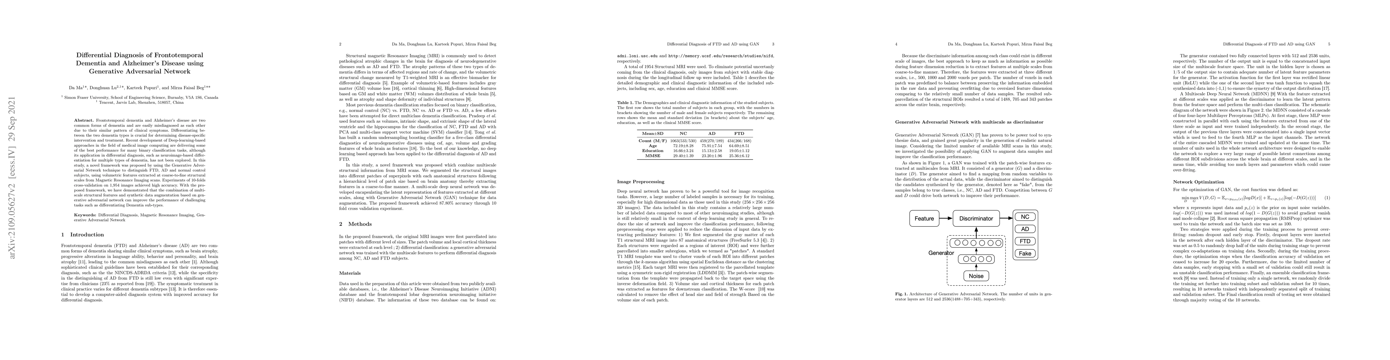 This research proposes a novel framework using Generative Adversarial Networks (GANs) to differentiate between frontotemporal dementia (FTD) and Alzheimer's disease (AD) from MRI scans, achieving high accuracy through multi-scale structural feature extraction and data augmentation. The method demonstrates improved performance in distinguishing these dementia types.