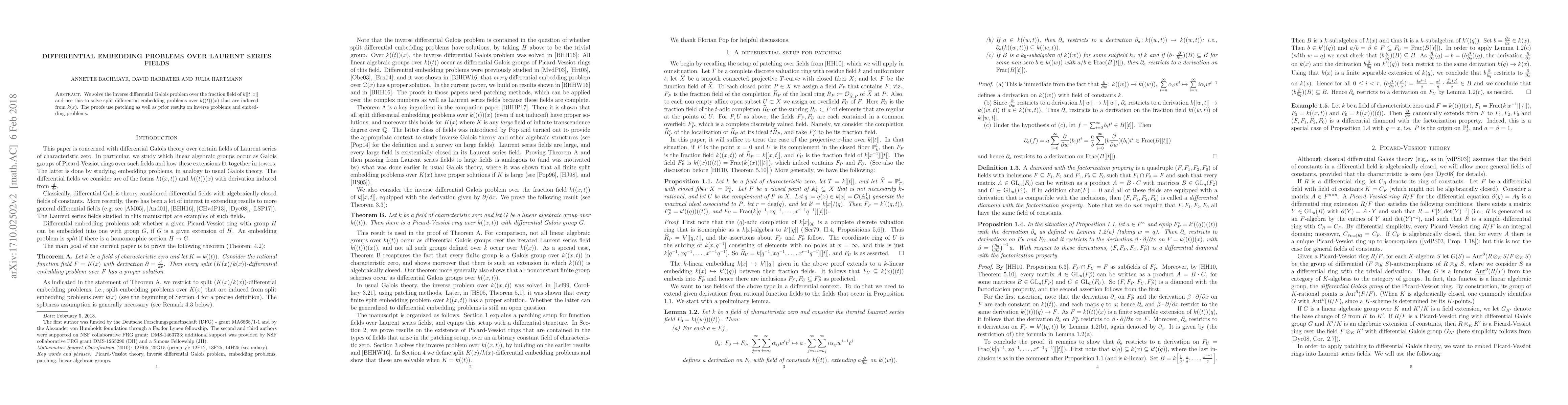 We solve the inverse differential Galois problem over the fraction field of $k[[t,x]]$ and use this to solve split differential embedding problems over $k((t))(x)$ that are induced from $k(x)$. The proofs use patching as well as prior results on inverse problems and embedding problems.