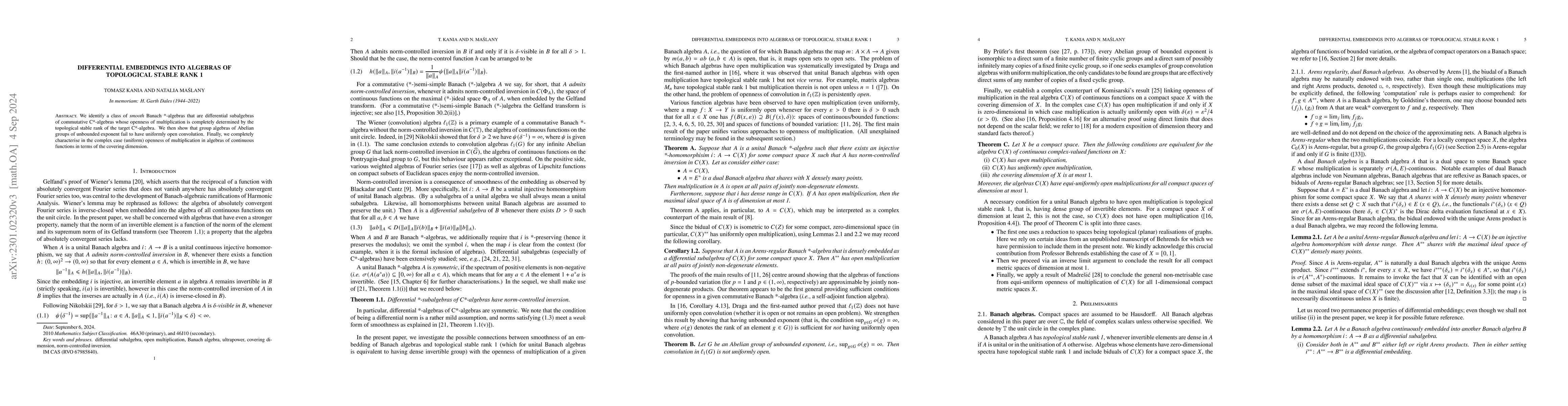 We identify a class of smooth Banach *-algebras that are differential subalgebras of commutative C*-algebras whose openness of multiplication is completely determined by the topological stable rank of the target C*-algebra. We then show that group algebras of Abelian groups of unbounded exponent fail to have uniformly open convolution. Finally, we completely characterise in the complex case (uniform) openness of multiplication in algebras of continuous functions in terms of the covering dimension.