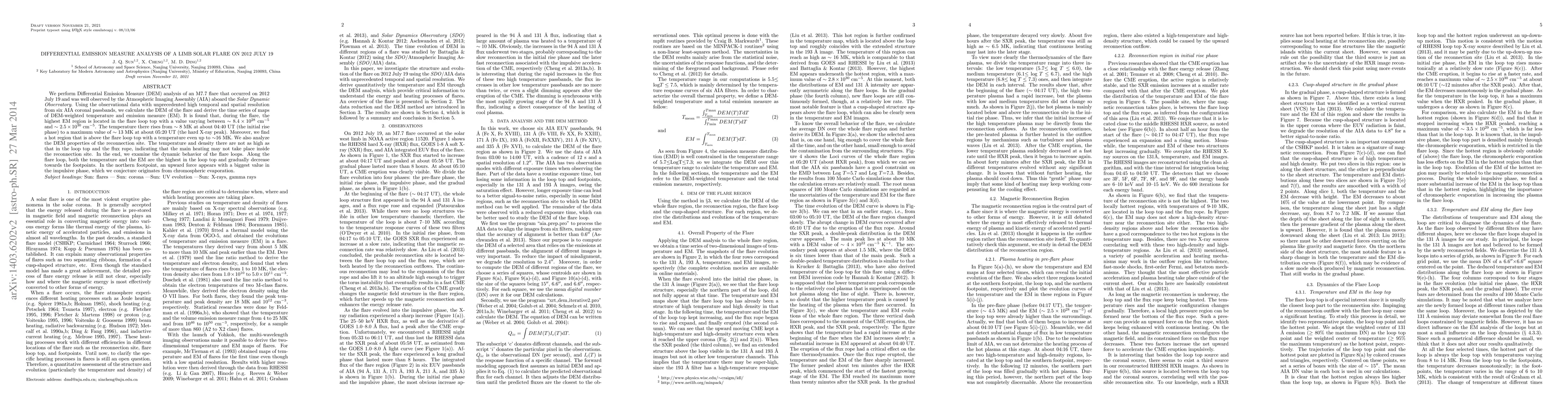 We perform Differential Emission Measure (DEM) analysis of an M7.7 flare that occurred on 2012 July 19 and was well observed by the Atmospheric Imaging Assembly (AIA) aboard the Solar Dynamic Observatory. Using the observational data with unprecedented high temporal and spatial resolution from six AIA coronal passbands, we calculate the DEM of the flare and derive the time series of maps of DEM-weighted temperature and emission measure (EM). It is found that, during the flare, the highest EM region is located in the flare loop top with a value varying between 8.4 10^28 cm^-5 and 2.5 10^30 cm^-5. The temperature there rises from 8 MK at about 04:40 UT (the initial rise phase) to a maximum value of 13 MK at about 05:20 UT (the hard X-ray peak). Moreover, we find a hot region that is above the flare loop top with a temperature even up to 16 MK. We also analyze the DEM properties of the reconnection site. The temperature and density there are not as high as that in the loop top and the flux rope, indicating that the main heating may not take place inside the reconnection site. In the end, we examine the dynamic behavior of the flare loops. Along the flare loop, both the temperature and the EM are the highest in the loop top and gradually decrease towards the footpoints. In the northern footpoint, an upward force appears with a biggest value in the impulsive phase, which we conjecture originates from chromospheric evaporation.