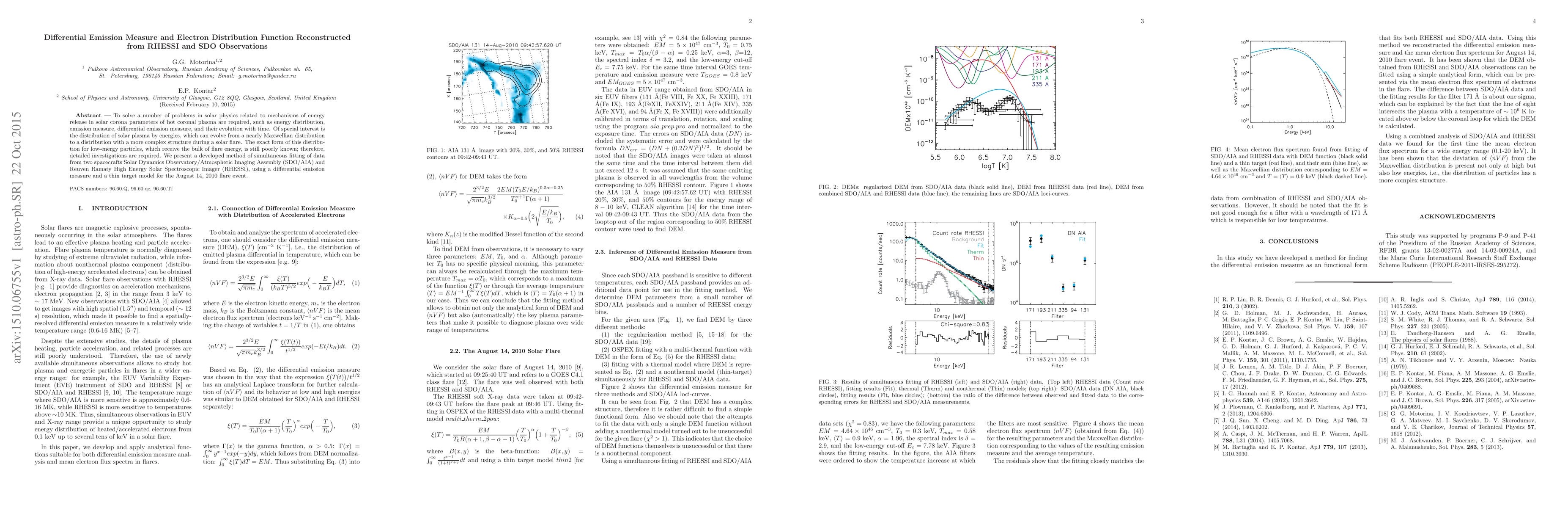 This paper presents a method for reconstructing the electron distribution function and differential emission measure of solar plasma during a flare using data from SDO/AIA and RHESSI. The study aims to better understand the energy release mechanisms in the solar corona by analyzing the evolution of plasma parameters during the August 14, 2010 flare event.