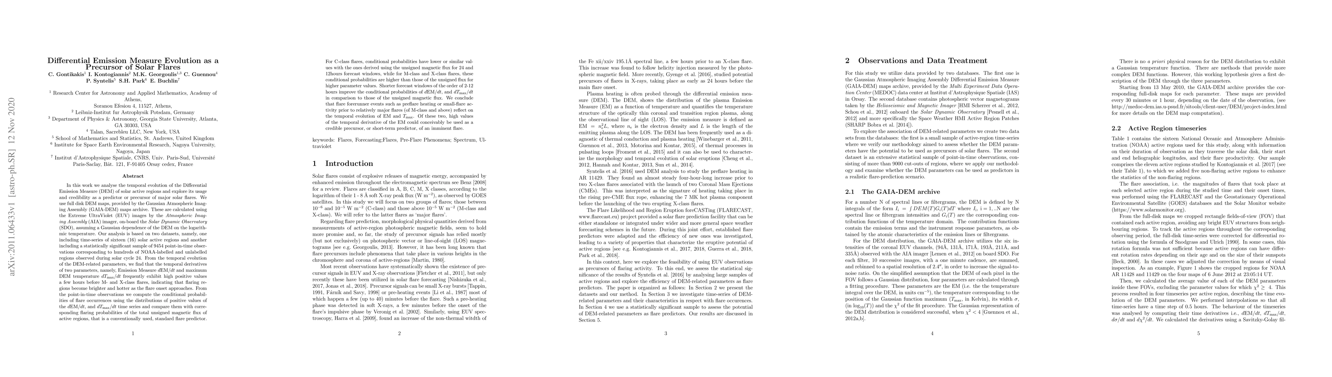 We analyse the temporal evolution of the Differential Emission Measure (DEM) of solar active regions and explore its usage in solar flare prediction. The DEM maps are provided by the Gaussian Atmospheric Imaging Assembly (GAIA-DEM) archive, calculated assuming a Gaussian dependence of the DEM on the logarithmic temperature. We analyse time-series of sixteen solar active regions and a statistically significant sample of 9454 point-in-time observations corresponding to hundreds of regions observed during solar cycle 24. The time-series analysis shows that the temporal derivatives of the Emission Measure dEM/dt and the maximum DEM temperature dTmax/dt frequently exhibit high positive values a few hours before M- and X-class flares, indicating that flaring regions become brighter and hotter as the flare onset approaches. From the point-in-time observations we compute the conditional probabilities of flare occurrences using the distributions of positive values of the dEM/dt, and dTmax/dt and compare them with corresponding flaring probabilities of the total unsigned magnetic flux, a conventionally used, standard flare predictor. For C-class flares, conditional probabilities have lower or similar values with the ones derived for the unsigned magnetic flux, for 24 and 12 hours forecast windows. For M- and X-class flares, these probabilities are higher than those of the unsigned flux for higher parameter values. Shorter forecast windows improve the conditional probabilities of dEM/dt, and dTmax/dt in comparison to those of the unsigned magnetic flux. We conclude that flare forerunner events such as preflare heating or small flare activity prior to major flares reflect on the temporal evolution of EM and Tmax. Of these two, the temporal derivative of the EM could conceivably be used as a credible precursor, or short-term predictor, of an imminent flare.