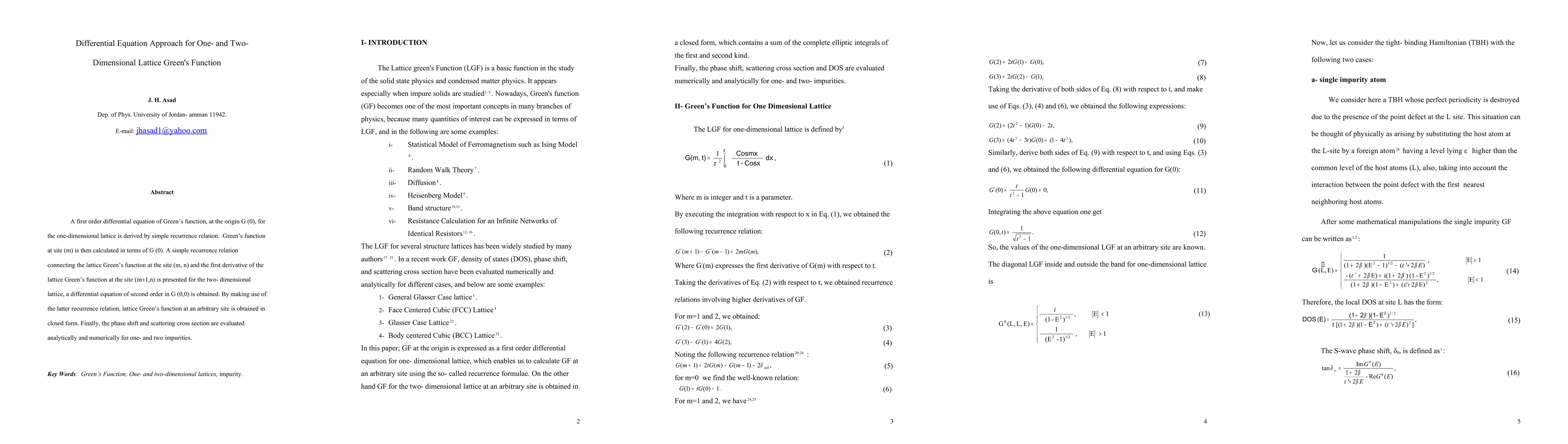 This paper derives first-order and second-order differential equations for Green's Function in one- and two-dimensional lattices, respectively, using recurrence relations. It provides closed-form solutions for lattice Green's Function at arbitrary sites and evaluates phase shift and scattering cross section analytically and numerically for single impurity cases.