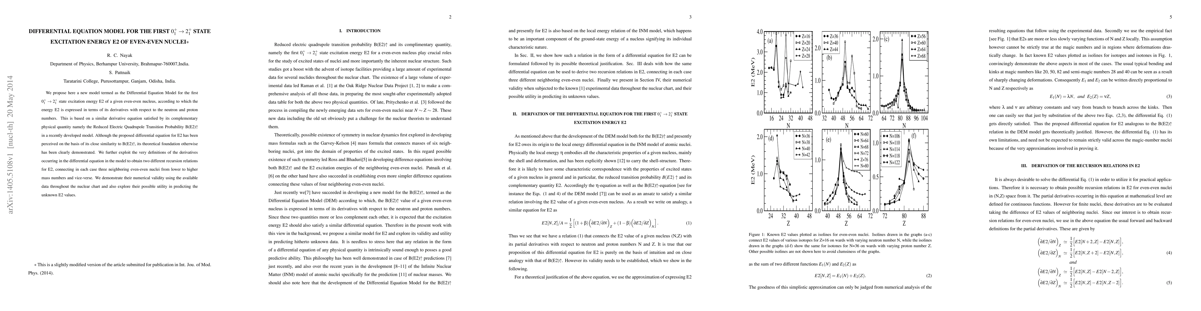 This paper introduces a Differential Equation Model for predicting the ground to first 2+ state excitation energy E2 in even-even nuclei, expressed via derivatives with respect to neutron and proton numbers. The model's theoretical foundation is demonstrated, and it provides recursion relations for E2, validated numerically against existing data and potentially useful for predicting unknown E2 values.