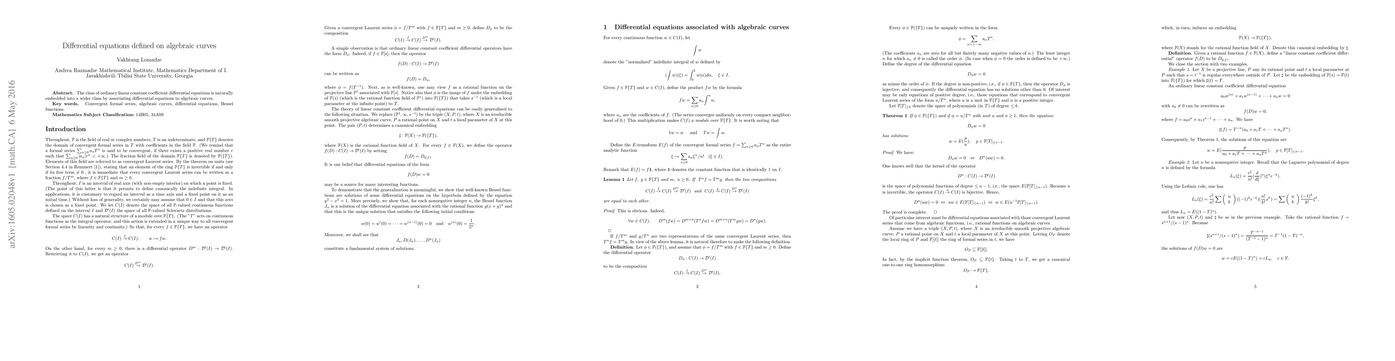 Summary: This paper explores how ordinary linear constant coefficient differential equations can be extended by associating them with algebraic curves, broadening their mathematical framework. The study highlights the intrinsic connection between differential equations and algebraic geometry.
