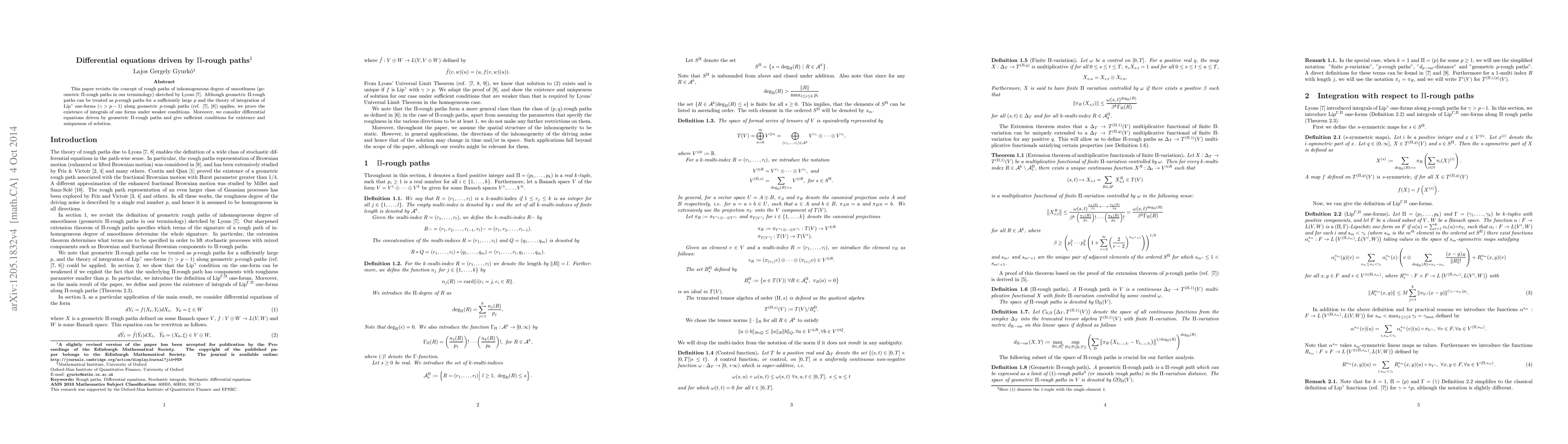 This paper revisits the concept of rough paths of inhomogeneous degree of smoothness (geometric \Pi-rough paths in our terminology) sketched by Lyons ("Differential equations driven by rough signals", Revista Mathematica Iber. Vol 14, Nr. 2,215-310, 1998). Although geometric \Pi-rough paths can be treated as p-rough paths for a sufficiently large p and the theory of integration of Lip-\gamma one-forms (\gamma>p-1) along geometric p-rough paths applies, we prove the existence of integrals of one-forms under weaker conditions. Moreover, we consider differential equations driven by geometric \Pi-rough paths and give sufficient conditions for existence and uniqueness of solution.