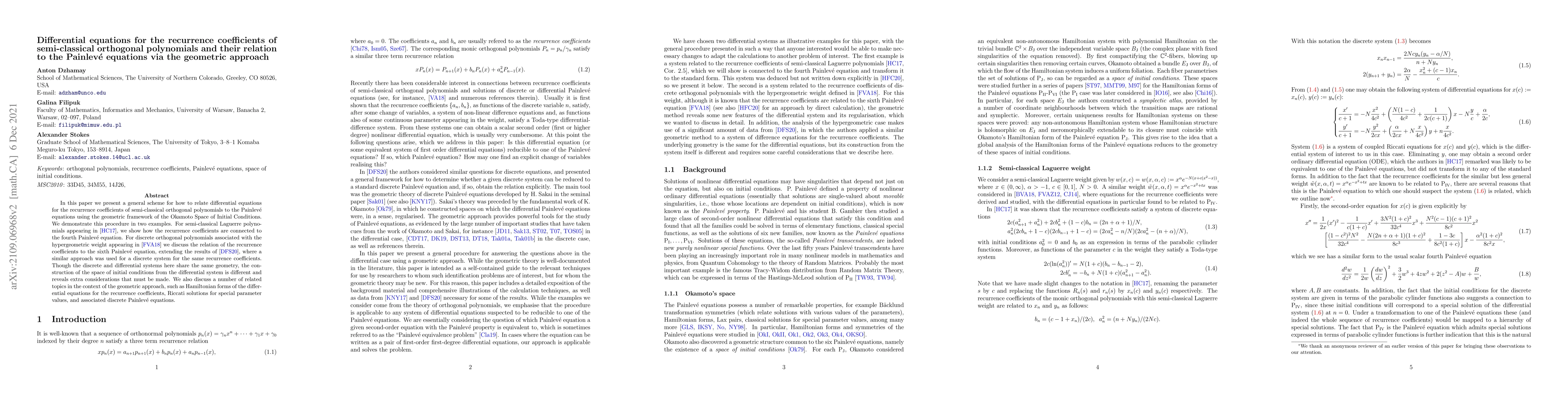 This paper establishes a link between differential equations for the recurrence coefficients of semi-classical orthogonal polynomials and the Painlevé equations through the geometric framework of Okamoto Space. It demonstrates this connection in two examples: semi-classical Laguerre polynomials relate to the fourth Painlevé equation, and discrete hypergeometric polynomials relate to the sixth Painlevé equation.