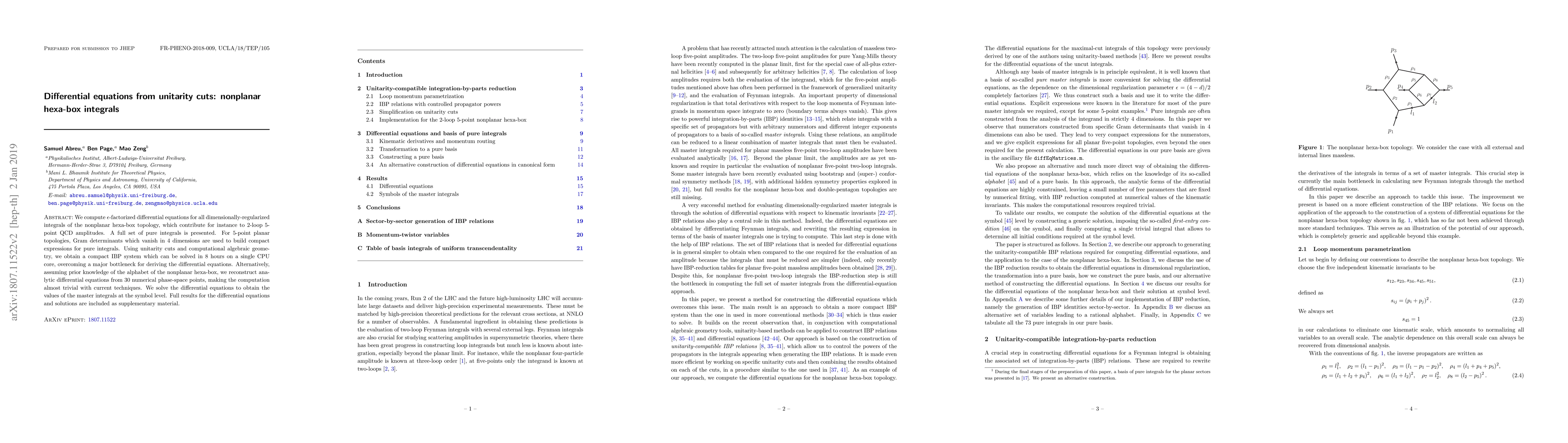 We compute $\epsilon$-factorized differential equations for all dimensionally-regularized integrals of the nonplanar hexa-box topology, which contribute for instance to 2-loop 5-point QCD amplitudes. A full set of pure integrals is presented. For 5-point planar topologies, Gram determinants which vanish in $4$ dimensions are used to build compact expressions for pure integrals. Using unitarity cuts and computational algebraic geometry, we obtain a compact IBP system which can be solved in 8 hours on a single CPU core, overcoming a major bottleneck for deriving the differential equations. Alternatively, assuming prior knowledge of the alphabet of the nonplanar hexa-box, we reconstruct analytic differential equations from 30 numerical phase-space points, making the computation almost trivial with current techniques. We solve the differential equations to obtain the values of the master integrals at the symbol level. Full results for the differential equations and solutions are included as supplementary material.