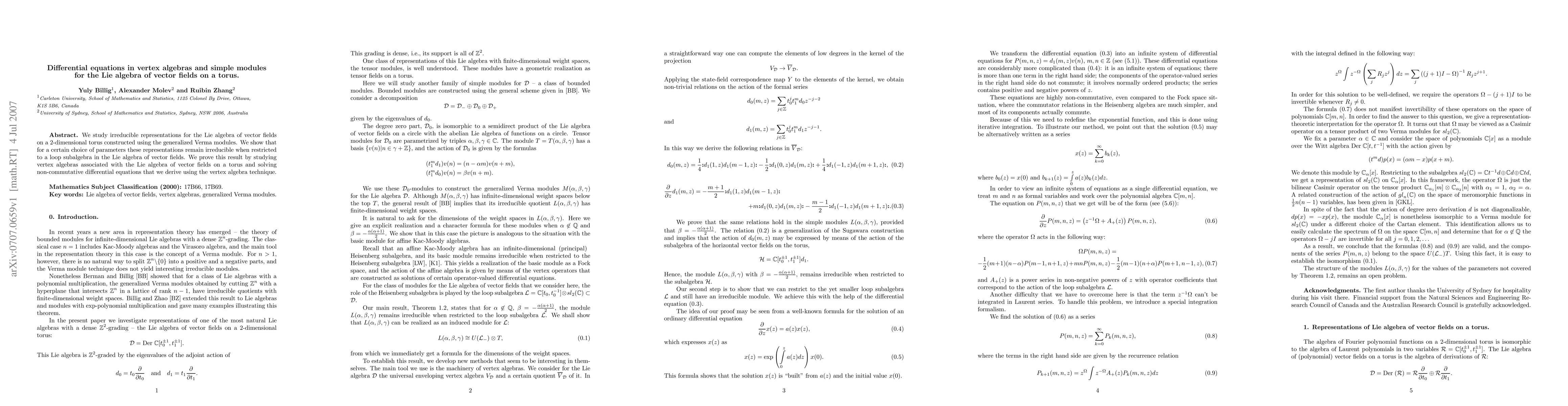We study irreducible representations for the Lie algebra of vector fields on a 2-dimensional torus constructed using the generalized Verma modules. We show that for a certain choice of parameters these representations remain irreducible when restricted to a loop subalgebra in the Lie algebra of vector fields. We prove this result by studying vertex algebras associated with the Lie algebra of vector fields on a torus and solving non-commutative differential equations that we derive using the vertex algebra technique.