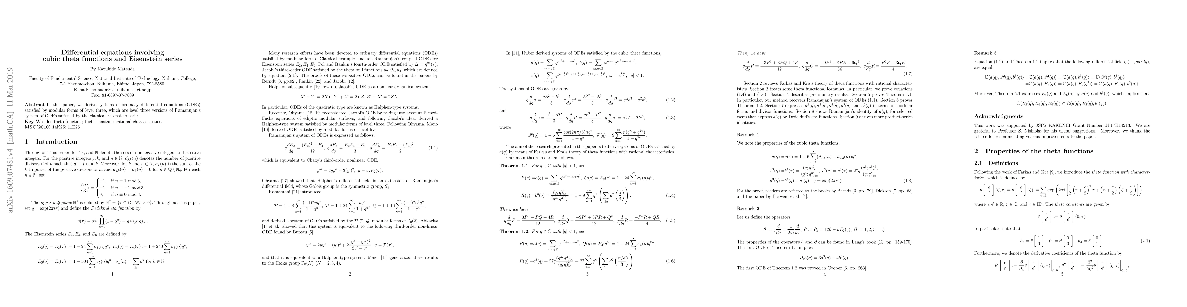 This paper derives ordinary differential equations (ODEs) for modular forms of level three, analogous to Ramanujan's ODEs for classical Eisenstein series, using cubic theta functions. These findings extend the classical theory to a higher level.