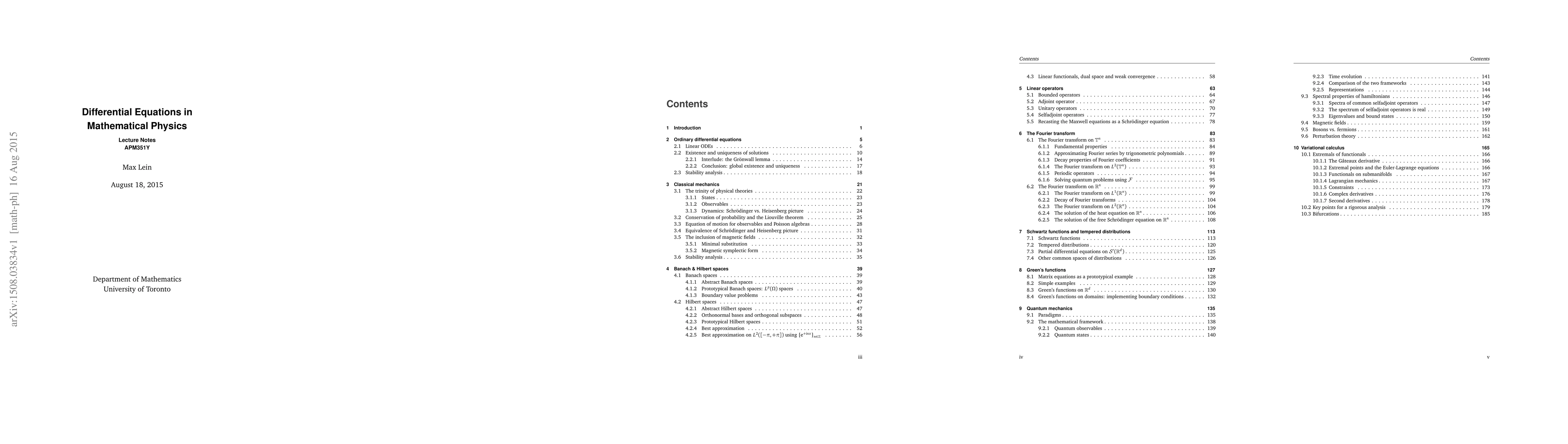 These lecture notes for the course APM 351 at the University of Toronto are aimed at mathematicians and physicists alike. It is not meant as an introductory course to PDEs, but rather gives an overview of how to view and solve differential equations that are common in physics. Among others, I cover Hamilton's equations, variations of the Schr\"odinger equation, the heat equation, the wave equation and Maxwells equations.