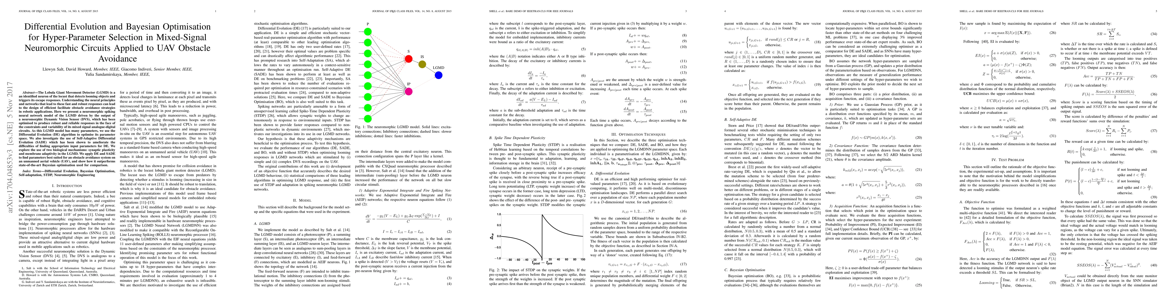 This paper presents a neuromorphic spiking neural network model of the Lobula Giant Movement Detector (LGMD) optimized for UAV obstacle avoidance using Differential Evolution and Self-Adaptive Differential Evolution. The study demonstrates superior performance compared to state-of-the-art Bayesian optimisation.