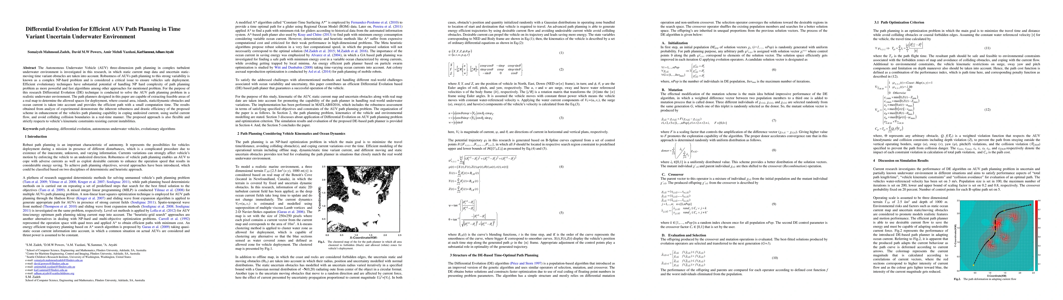 This research explores the use of Differential Evolution for efficient path planning of Autonomous Underwater Vehicles (AUVs) in turbulent, time-variant underwater environments with static and dynamic obstacles. The proposed method demonstrates robustness and efficiency in navigating complex environments, respecting kinematic constraints and minimizing computation time.