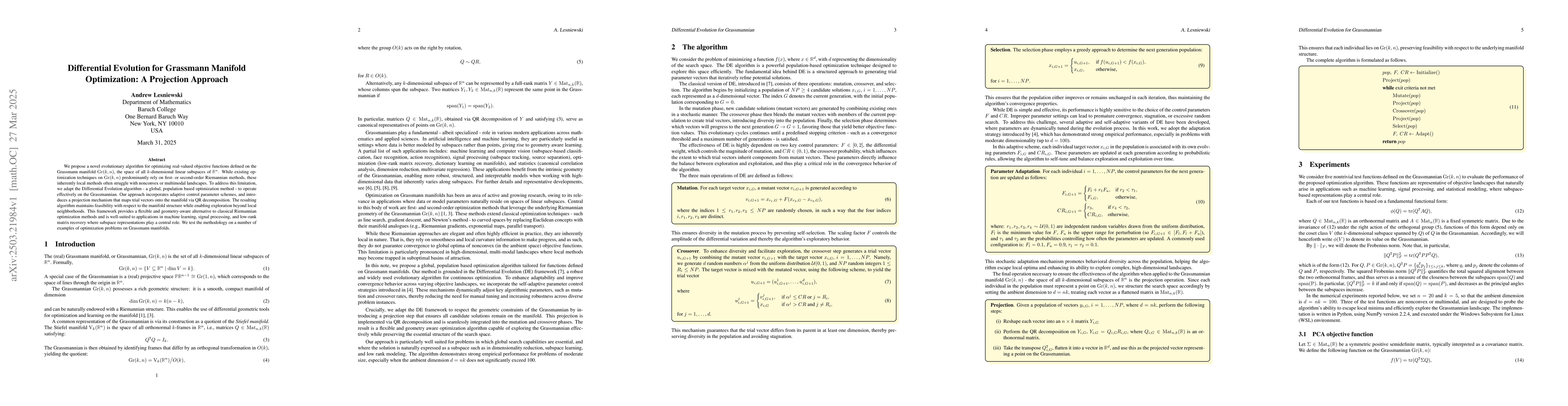 The proposed method combines Differential Evolution with adaptive control parameters and a projection mechanism tailored for Grassmann manifold optimization, offering a novel global approach to tackle nonconvex and multimodal landscapes.