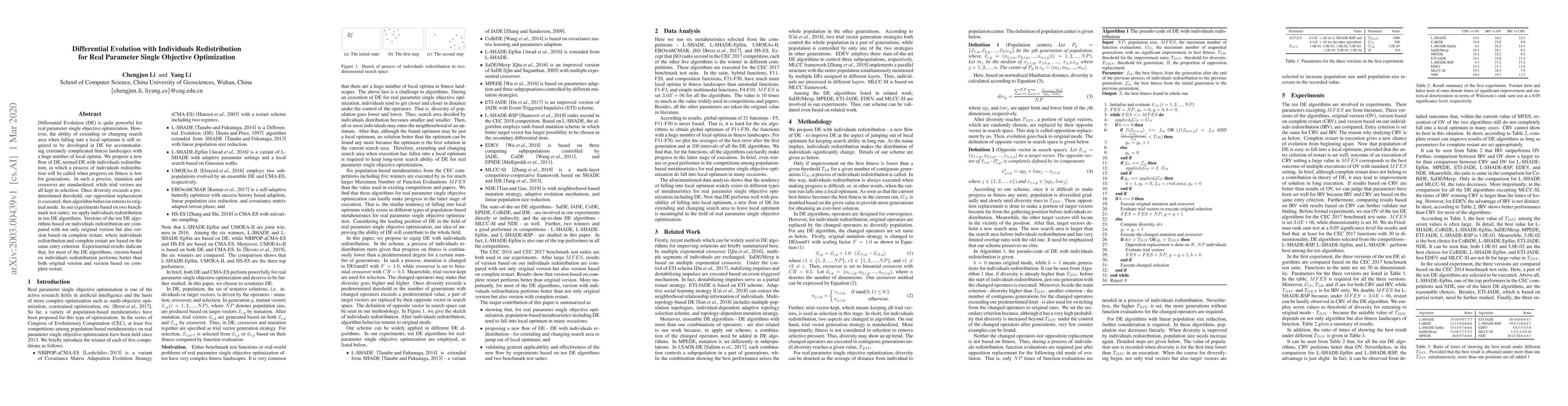 Differential Evolution (DE) is quite powerful for real parameter single objective optimization. However, the ability of extending or changing search area when falling into a local optimum is still required to be developed in DE for accommodating extremely complicated fitness landscapes with a huge number of local optima. We propose a new flow of DE, termed DE with individuals redistribution, in which a process of individuals redistribution will be called when progress on fitness is low for generations. In such a process, mutation and crossover are standardized, while trial vectors are all kept in selection. Once diversity exceeds a predetermined threshold, our opposition replacement is executed, then algorithm behavior returns to original mode. In our experiments based on two benchmark test suites, we apply individuals redistribution in ten DE algorithms. Versions of the ten DE algorithms based on individuals redistribution are compared with not only original version but also version based on complete restart, where individuals redistribution and complete restart are based on the same entry criterion. Experimental results indicate that, for most of the DE algorithms, version based on individuals redistribution performs better than both original version and version based on complete restart.