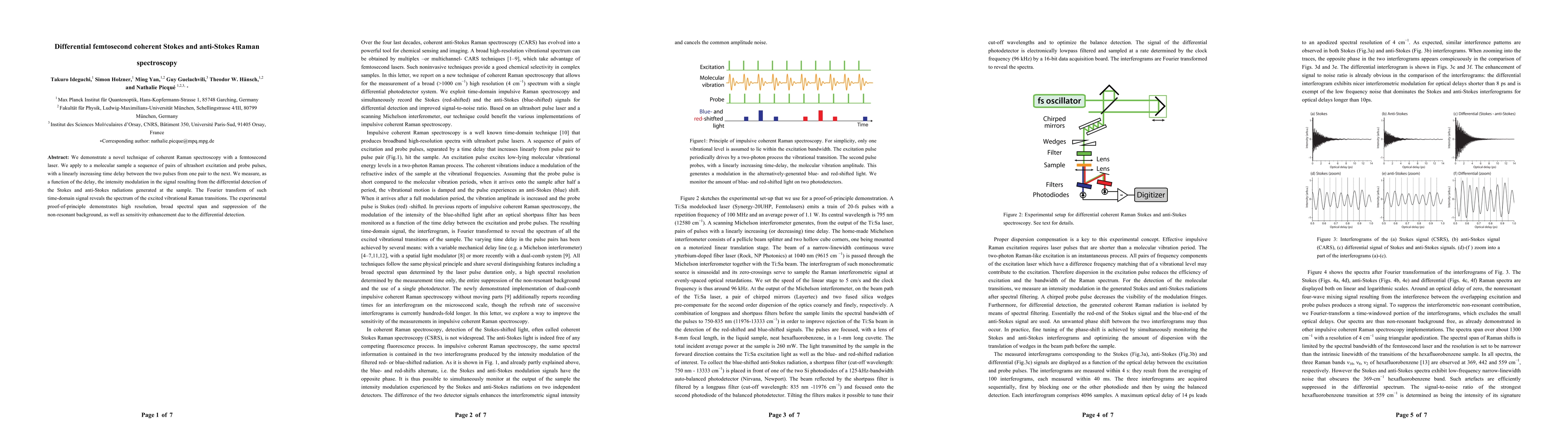 This paper introduces a novel femtosecond coherent Raman spectroscopy technique using ultrashort laser pulses to achieve high-resolution, broad spectral range Raman spectroscopy with non-resonant background suppression and enhanced sensitivity through differential detection of Stokes and anti-Stokes signals.