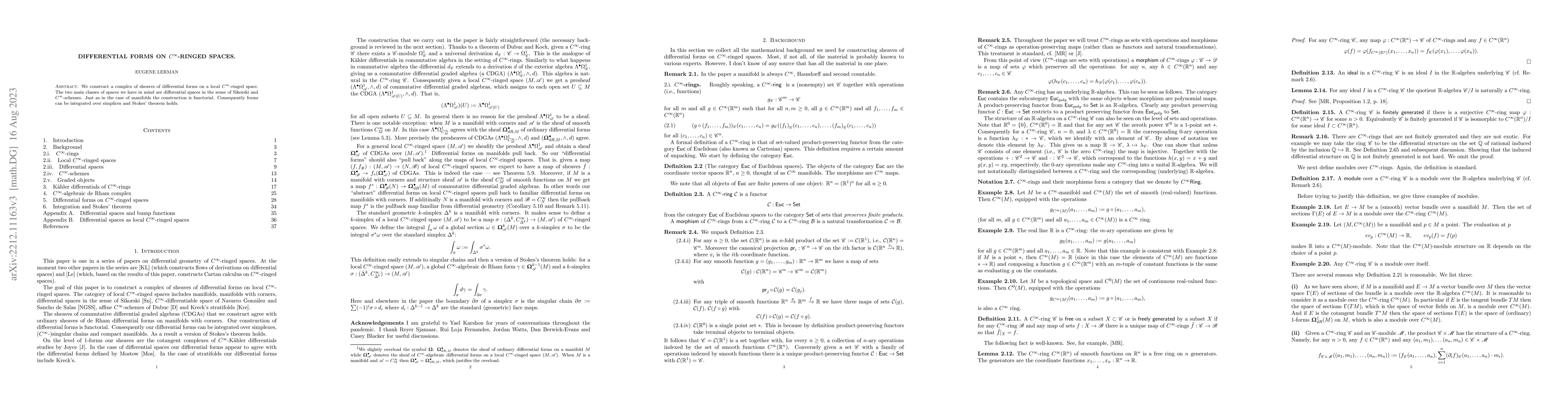 The paper constructs a complex of differential forms on $C^\infty$-ringed spaces, focusing on differential spaces and $C^\infty$-schemes, ensuring a functorial construction that allows integration over simplices and validates Stokes' theorem.