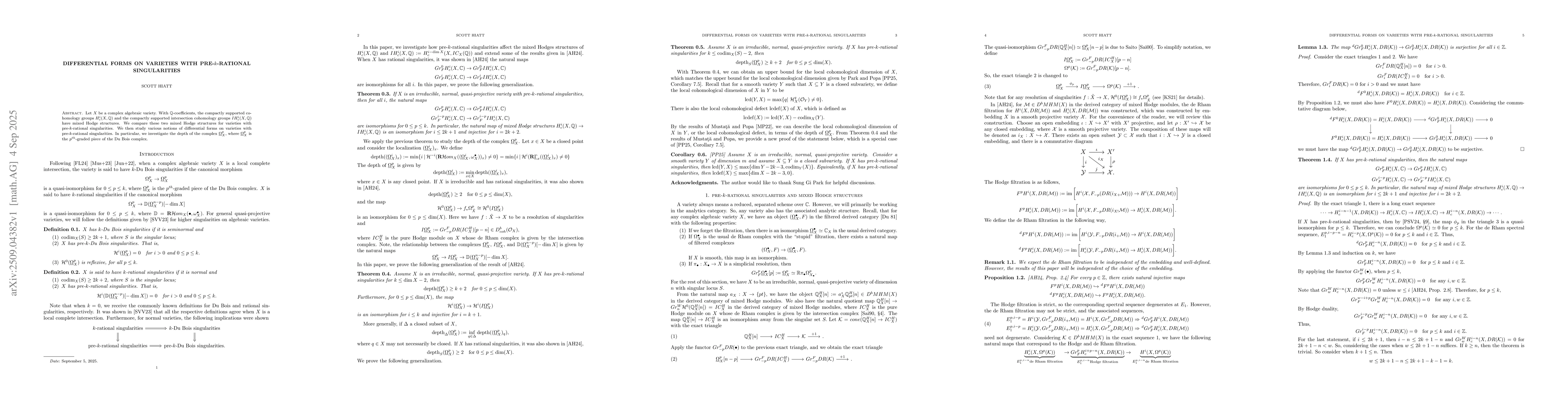 Let $X$ be a complex algebraic variety. With $\mathbb{Q}$-coefficients, the compactly supported cohomology groups $H^{i}_{c}(X, \mathbb{Q})$ and the compactly supported intersection cohomology groups $IH^{i}_{c}(X, \mathbb{Q})$ have mixed Hodge structures. We compare these two mixed Hodge structures for varieties with pre-$k$-rational singularities. We then study various notions of differential forms on varieties with pre-$k$-rational singularities. In particular, we investigate the depth of the complex $\underline{\Omega}^{p}_{X}$, where $\underline{\Omega}^{p}_{X}$ is the $p^{th}$-graded piece of the Du Bois complex.
