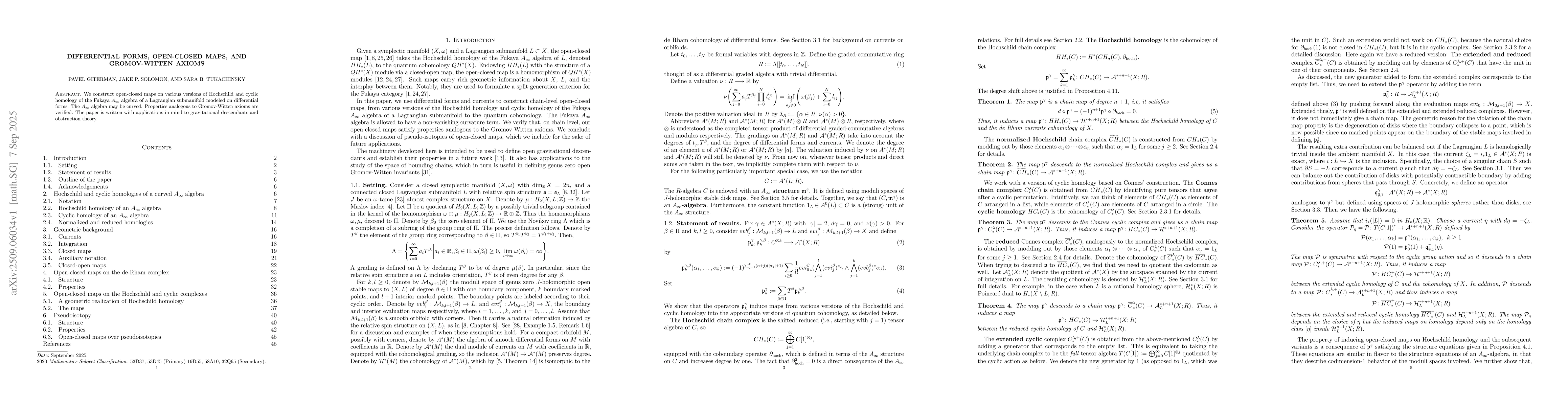 We construct open-closed maps on various versions of Hochschild and cyclic homology of the Fukaya $A_\infty$ algebra of a Lagrangian submanifold modeled on differential forms. The $A_\infty$ algebra may be curved. Properties analogous to Gromov-Witten axioms are verified. The paper is written with applications in mind to gravitational descendants and obstruction theory.
