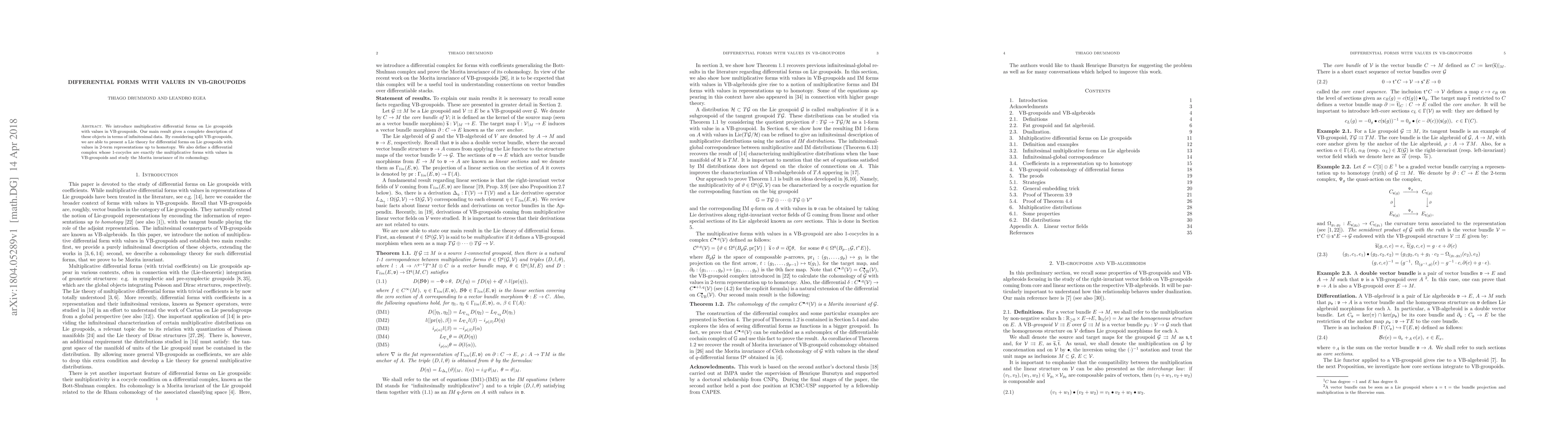This paper introduces multiplicative differential forms on Lie groupoids with values in VB-groupoids, providing a complete description using infinitesimal data and exploring their Morita invariance. It also constructs a differential complex whose cohomology represents these forms, establishing a Lie theory for them in 2-term representations up to homotopy.