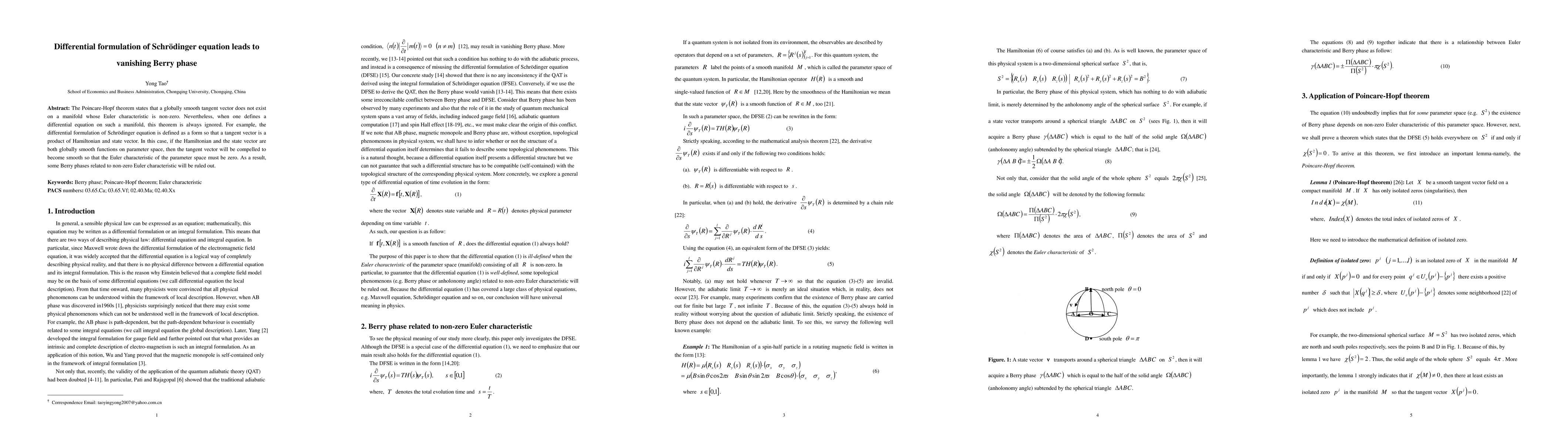 The Poincare-Hopf theorem states that a globally smooth tangent vector does not exist on a manifold whose Euler characteristic is non-zero. Nevertheless, when one defines a differential equation on such a manifold, this theorem is always ignored. For example, the differential formulation of Schrodinger equation is defined as a form so that a tangent vector is a product of Hamiltonian and state vector. In this case, if the Hamiltonian and the state vector are both globally smooth functions on parameter space, then the tangent vector will be compelled to become smooth so that the Euler characteristic of the parameter space must be zero. As a result, some Berry phases related to non-zero Euler characteristic will be ruled out.