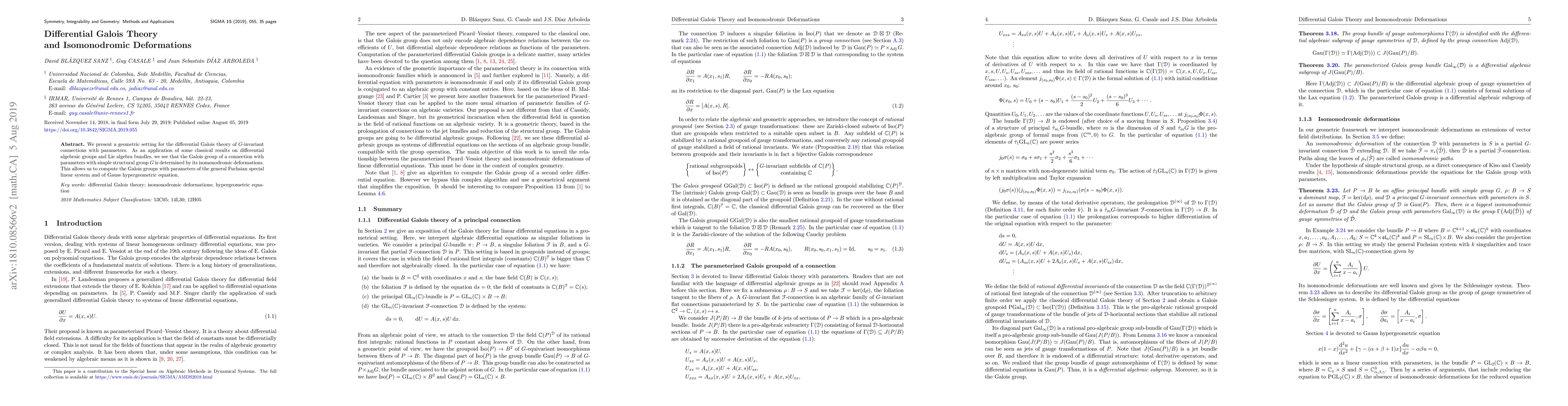This paper develops a geometric framework for differential Galois theory of $G$-invariant connections with parameters, showing that the Galois group is determined by isomonodromic deformations, and applies these results to compute the Galois groups for Fuchsian systems and the Gauss hypergeometric equation.