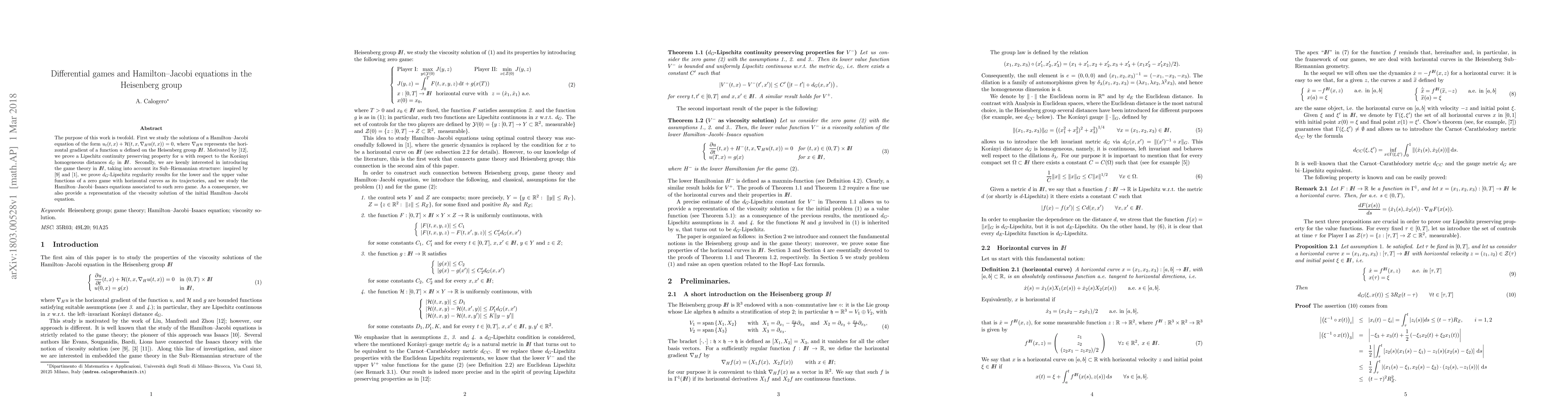 The purpose of this work is twofold. First we study the solutions of a Hamilton-Jacobi equation of the form $u_t(t,x)+\mathcal{H}(t,x,\nabla_H u(t,x))=0$, where $\nabla_H u$ represents the horizontal gradient of a function $u$ defined on the Heisenberg group ${I\!\!H}$. Motivated by the recent paper by Liu, Manfredi and Zhou (\cite{LiMaZh2016}), we prove a Lipschitz continuity preserving property for $u$ with respect to the Kor\'anyi homogeneous distances $d_G$ in ${I\!\!H}$. Secondly, we are keenly interested in introducing the game theory in ${I\!\!H}$, taking into account its Sub-Riemannian structure: inspired by ideas in the paper of Evans and Souganidis (see \cite{EvSo1984}), in the paper of and Balogh, Calogero and Pini \cite{BaCaPi2014}, we prove $d_G$-Lipschitz regularity results for the lower and the upper value functions of a zero game with horizontal curves as its trajectories, and we study the Hamilton-Jacobi-Isaacs equations associated to such zero game. As a consequence, we also provide a representation of the viscosity solution of the initial Hamilton-Jacobi equation.