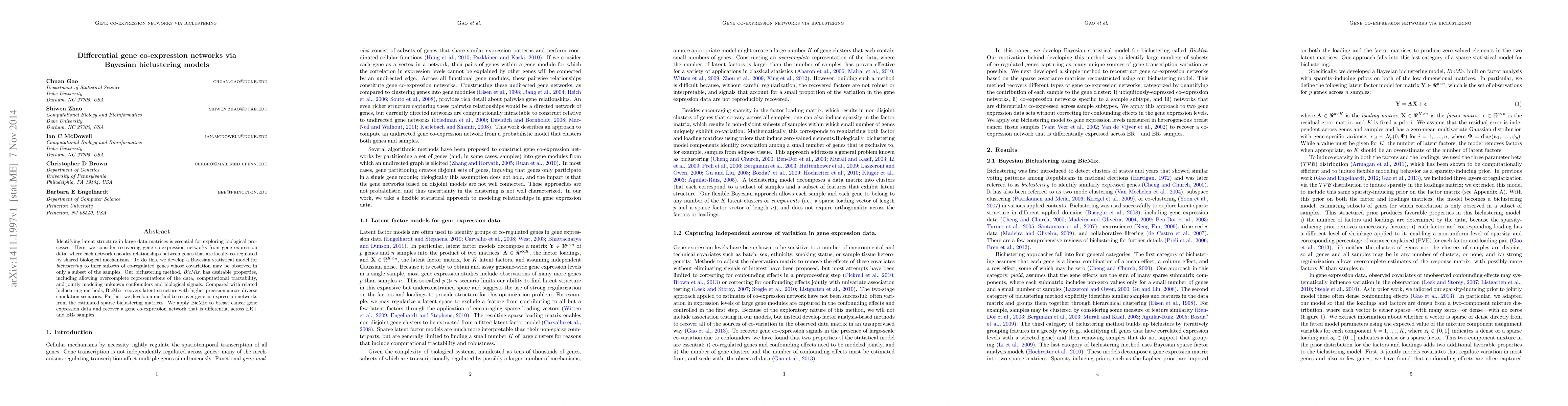This paper introduces a Bayesian biclustering model, BicMix, to identify gene co-expression networks from expression data, allowing for locally co-regulated genes in subsets of samples. BicMix outperforms other methods in precision and is applied to breast cancer data to reveal differential networks between ER+ and ER- samples.