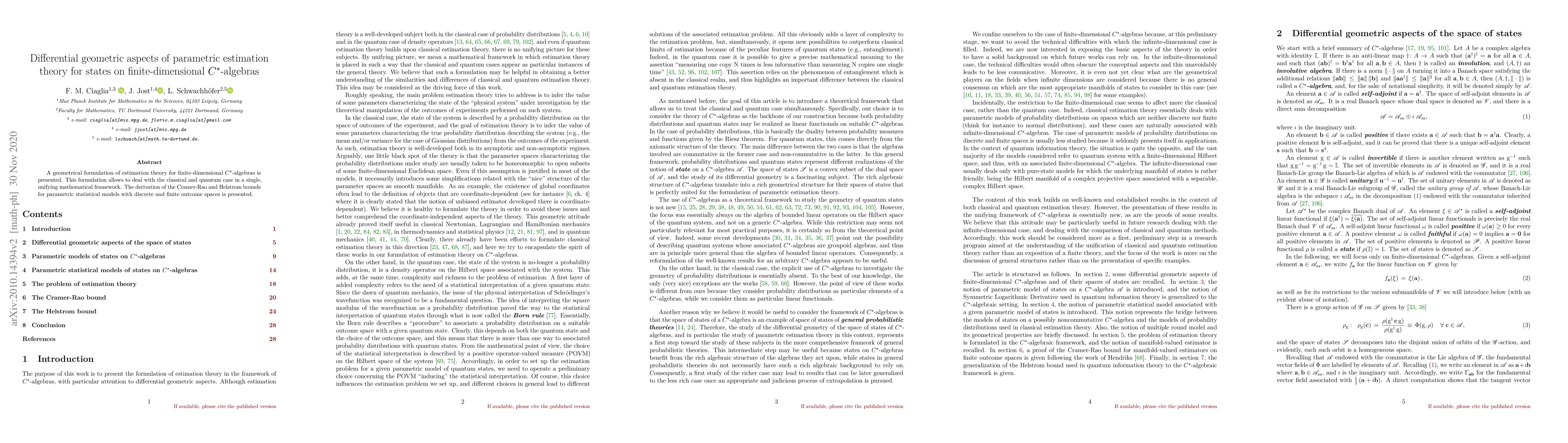 A geometrical formulation of estimation theory for finite-dimensional $C^{\star}$-algebras is presented. This formulation allows to deal with the classical and quantum case in a single, unifying mathematical framework. The derivation of the Cramer-Rao and Helstrom bounds for parametric statistical models with discrete and finite outcome spaces is presented.