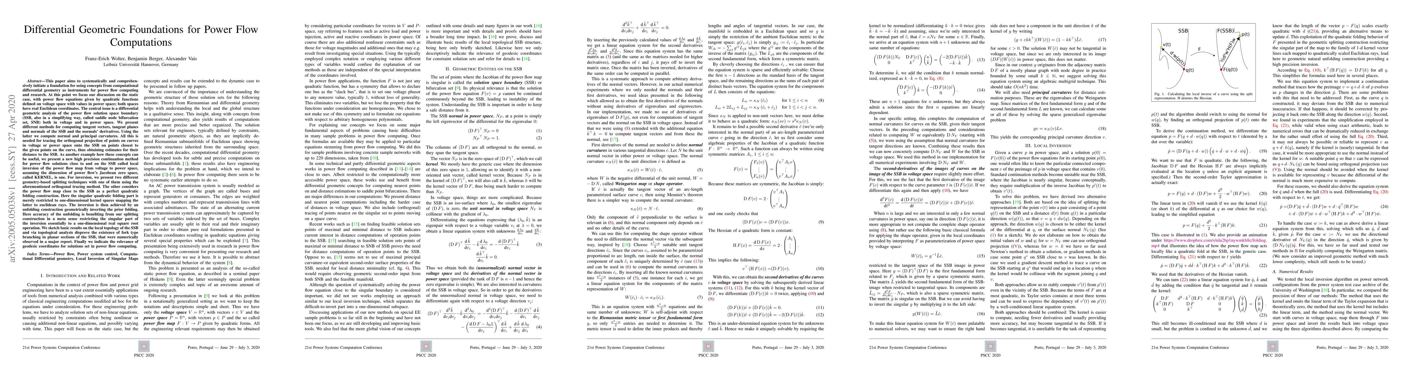 This paper aims to systematically and comprehensively initiate a foundation for using concepts from computational differential geometry as instruments for power flow computing and research. At this point we focus our discussion on the static case, with power flow equations given by quadratic functions defined on voltage space with values in power space; both spaces have real Euclidean coordinates. The central issue is a differential geometric analysis of the power flow solution space boundary (SSB, also in a simplifying way, called saddle node bifurcation set, SNB) both in voltage and in power space. We present different methods for computing tangent vectors, tangent planes and normals of the SSB and the normals' derivatives. Using the latter we compute normal and principal curvatures. All this is needed for tracing the orthogonal projection of points on curves in voltage or power space onto the SSB on points closest to the given points on the curve, thus obtaining estimates for their distance to the SSB. As another example how these concepts can be useful, we present a new high precision continuation method for power flow solutions close to and on the SSB called local inversion of the power flow map from voltage to power space, assuming the dimension of power flow's Jacobean zero space, called KERNEL, is one. For inversion, we present two different geometry-based splitting techniques with one of them using the aforementioned orthogonal tracing method.